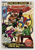 Tags: Spider-Man$31.00This annual features three reprint stories and a new cover by John Romita. First story reprinted from Amazing Spider-Man Annual 1: "The Sinister Six!" Script by Stan Lee. Art by Steve Ditko. The web-slinger battles the Vulture, Kraven, Mysterio, Electro, Dr. Octopus, and the Sandman to save Aunt May and Betty Brant! Second story reprinted from Fantastic Four Annual 1: "The Fabulous Fantastic Four Meet Spider-Man!" Script by Stan Lee. Pencils by Jack Kirby. Inks by Steve Ditko. This 6-page story expands upon the wall-crawler's first meeting (and fight) with the FF in Amazing Spider-Man 1. Third story reprinted from Amazing Spider-Man 8: "Spider-Man Tackles the Torch!" Guest-starring the Fantastic Four. Script by Stan Lee. Pencils by Jack Kirby. Inks by Steve Ditko. Spidey crashes Johnny's party and creates a ruckus. 25 cent cover price. 68 pgs. Cover price $0.25.