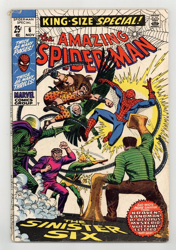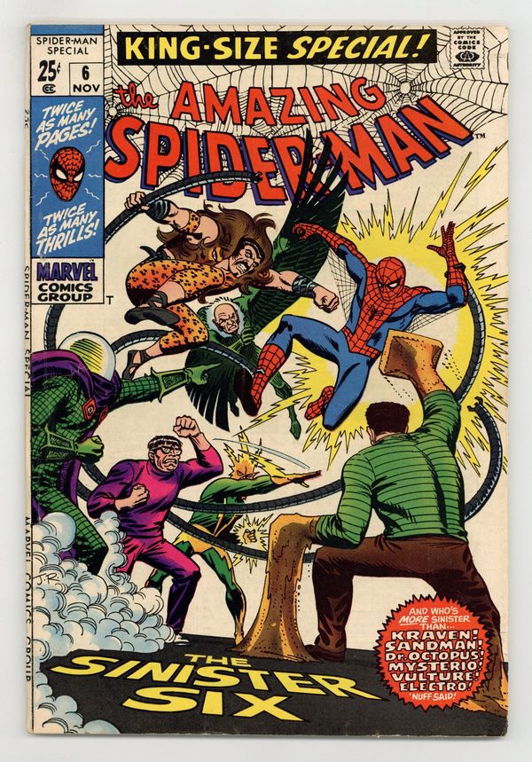 This annual features three reprint stories and a new cover by John Romita. First story reprinted from Amazing Spider-Man Annual 1: "The Sinister Six!" Script by Stan Lee. Art by Steve Ditko. The web-slinger battles the Vulture, Kraven, Mysterio, Electro, Dr. Octopus, and the Sandman to save Aunt May and Betty Brant! Second story reprinted from Fantastic Four Annual 1: "The Fabulous Fantastic Four Meet Spider-Man!" Script by Stan Lee. Pencils by Jack Kirby. Inks by Steve Ditko. This 6-page story expands upon the wall-crawler's first meeting (and fight) with the FF in Amazing Spider-Man 1. Third story reprinted from Amazing Spider-Man 8: "Spider-Man Tackles the Torch!" Guest-starring the Fantastic Four. Script by Stan Lee. Pencils by Jack Kirby. Inks by Steve Ditko. Spidey crashes Johnny's party and creates a ruckus. 25 cent cover price. 68 pgs. Cover price $0.25.