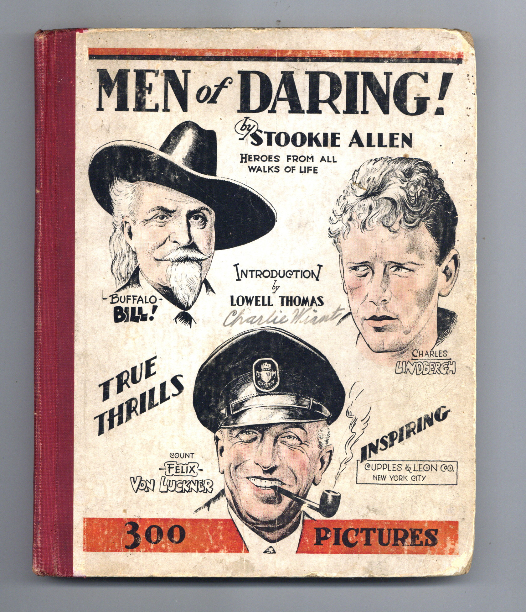 Published 1933 by Cupples & Leon.$26.00No dust jacket; item graded based on book only. Men of Daring, text and illustrations by Stookie Allen with an introduction by newsman Lowell Thomas. Published 1933 by Cupples & Leon Co., reprinting multi-image box cartoons featuring heroic individual from history and the contemporanious world, all originally published via newspaper syndication. A platimun age precursor to modern day comics book. Hundreds of interesting people, some still famous, other long forgotten, populate this fascinating book with their images (as rendered by Allen) together with snippets of fact that explain their lasting (or fleeting) fame. 7 x 8-3/4 inches, hardcover, black-and-white, 100 pages with dust jacket (dust jacket images are repeated on hardback covers. Cover price $0.10.