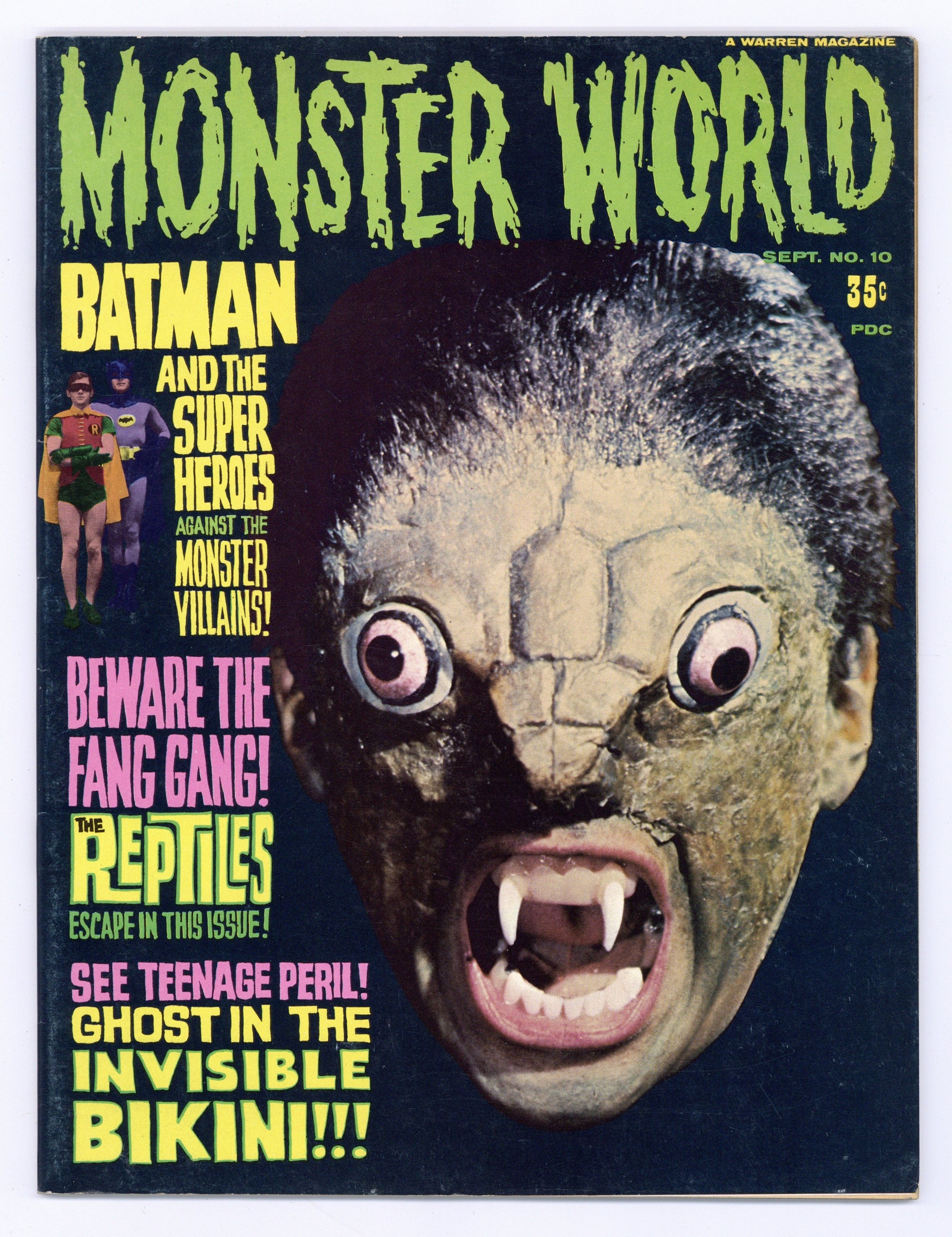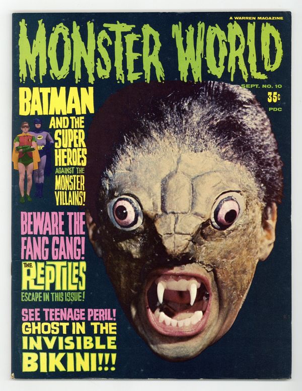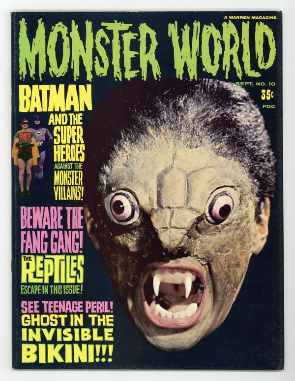 Tags: Batman$21.00Features in this issue include: previews of The Reptiles and Surf Terror; a reprint of "Lon Chaney Jr. Talks to You'; an article about the superheroes of film and television; "Creature's Crossweird Puzzle"; Dracula, Prince of Darkness filmbook; and more. Cover photo is of The Reptile. The back of the mag depicts an ad for Aurora's Wonder Woman model kit. Cover price $0.35.
