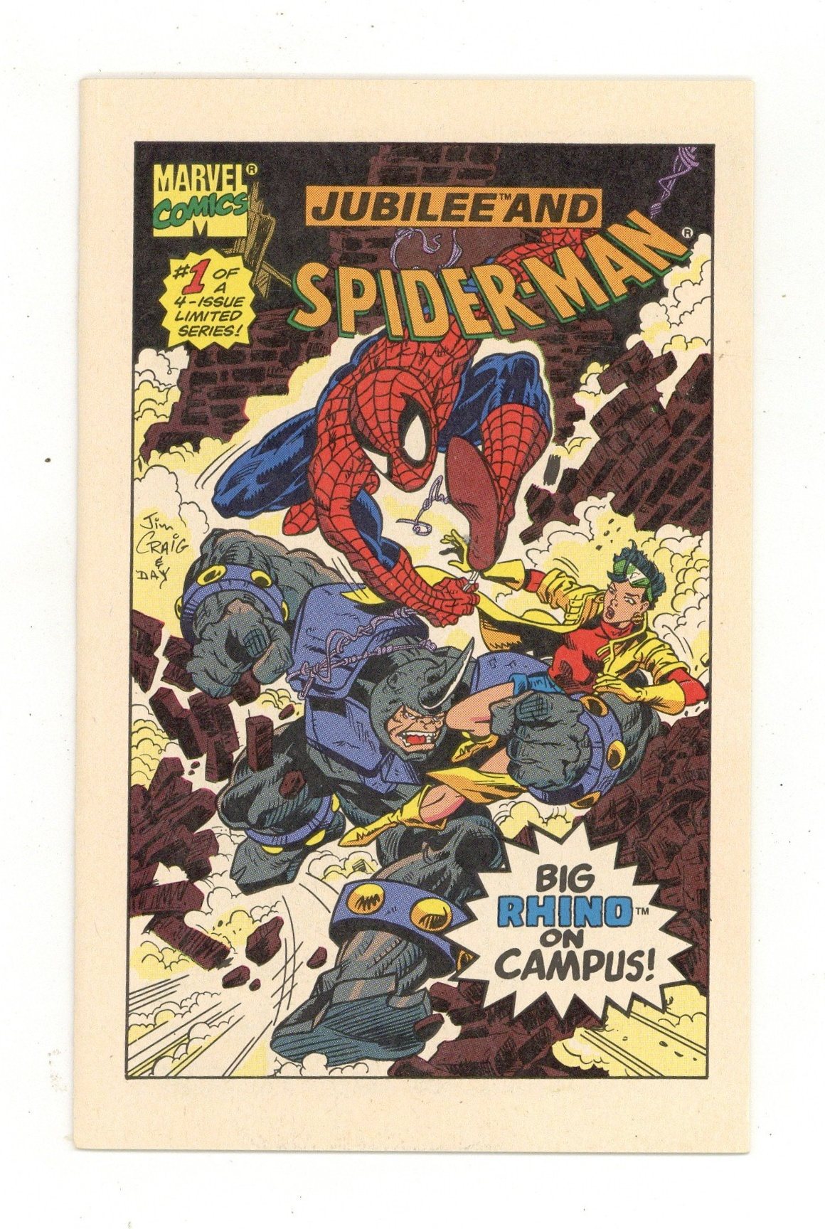 $18.00Indicia (Amazing Spider-Man: Carnage on Campus). # 1 of 4 issue limited series. Packaged and given away with Drake's snack cakes. Jubilee and Spider-Man (1993) is a promotional comic book distributed by Drake's Snack Cakes. Written by Eric Fein, pencils by Jim Craig, inks by Dan and David Day. "Carnage on Campus" features a team-up with Spider-Man and Jubilee, the youngest member of the Uncanny X-Men. They must stop the powerful Rhino before he destroys Empire State University. 16 pages, full color, 3-in. x 5-in., card stock, with no cover price. Craig/Day cover.