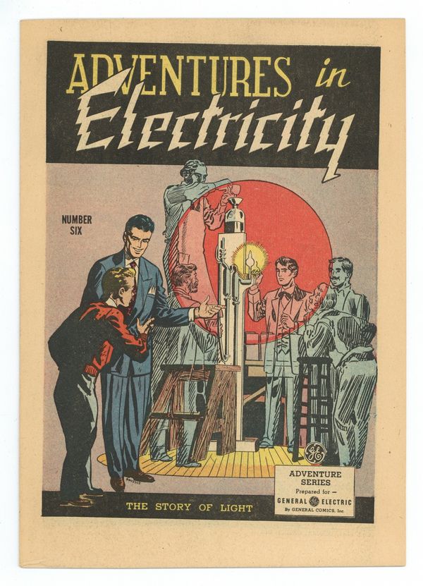 Published 1949 by Pictorial Media.$19.50APG 17-7 "Story of Light". Promotional comic published by General Comics for General Electric as part of their Adventure Series. Illustrated by George "Inky" Roussos, who is also known for his work on Batman. Conventional 7-in. x10-in. comic size 16-page full color all newsprint comic with a 1949 copyright. Reprinted in 1954 as Story of Light.