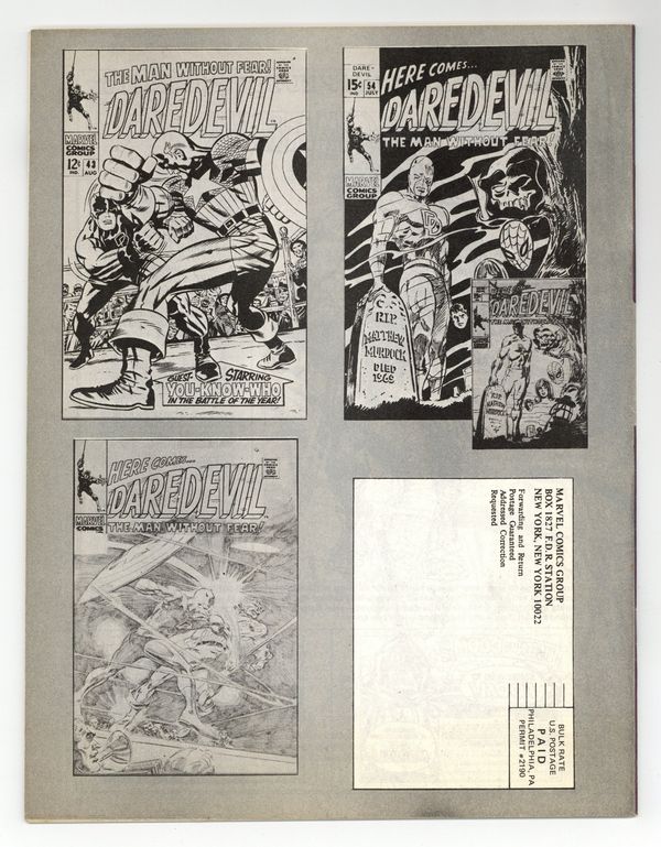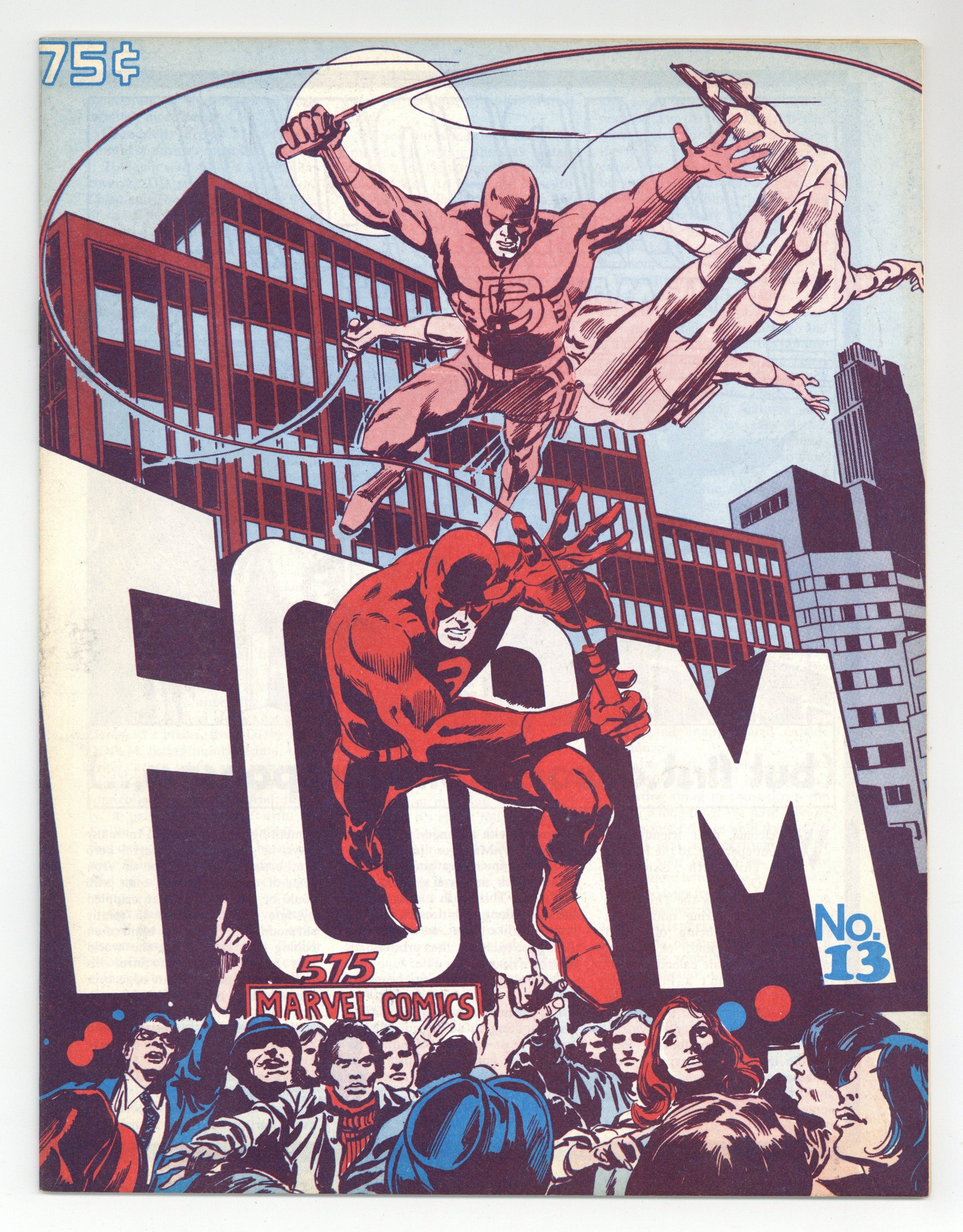 Daredevil issue. Illustrations by Gene Colan (including a penciled Daredevil page for a never-published story, plus unused cover versions of Daredevil 43 and 54), Wally Wood, Marie Severin, Bob Hall, and Larry Mahlstedt. New FOOM editor Chris Claremont interviews Stan Lee and Marv Wolfman. Articles on Daredevil, Karen Page, the Black Widow, Heather Glenn, and the British editions of Marvel Comics. Daredevil checklist (issues 1-134). Bill Mantlo interviewed about Woodgod. Colan/Tom Palmer cover. Cover price $0.75.