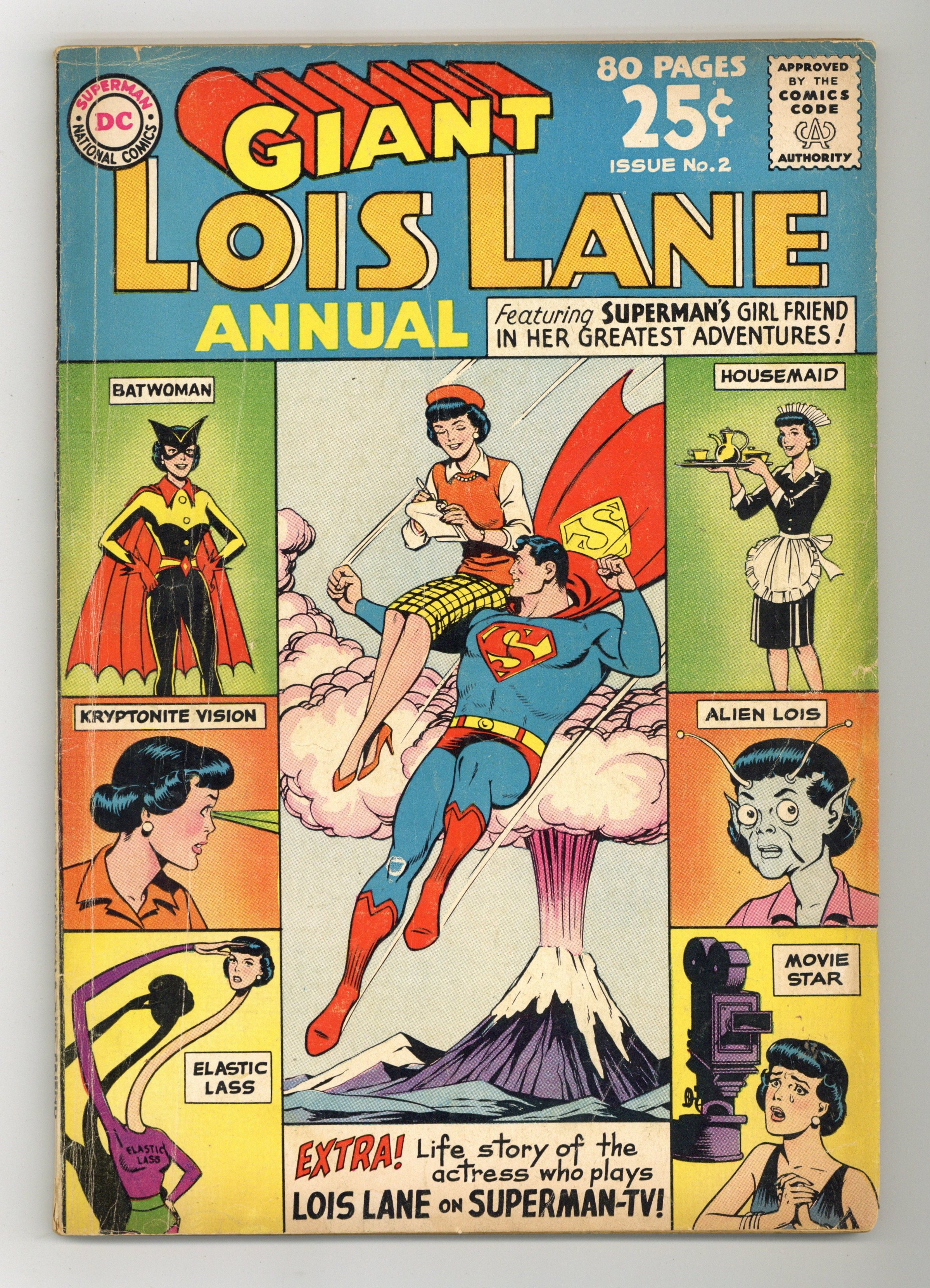 Table of Contents: "Lois Lane's Kiss of Death" Lois defies a weird curse - and regrets it! "The Man Who Married Lois Lane" (pencils by Wayne Boring) The girl reporter weds a suitor from the future! "Lois Lane in Hollywood" Lois goofs and goofs when she yearns to be a movie actress! "The Girl Atlas" -reprints Superman's Girlfriend Lois Lane #12. Woe is Lois when her rival, Lana Lang, becomes invulnerable! "Lois Lane's Secret Romance" -reprints Superman's Girlfriend Lois Lane #14. See what happens when mighty SUPERGIRL plays Cupid for Lois! "The Kryptonite Girl" -reprints Superman's Girlfriend Lois Lane #16. Lois exiles herself when she becomes a menace to Superman! "The Wedding of Jimmy Olsen" (pencils by Curt Swan) -reprints Superman's Girlfriend Lois Lane #21. Due to a misunderstanding, Jimmy thinks Lois wants to be his wife! "The 10 Feats of Elastic Lass" Lois s-t-r-e-t-c-h-e-s herself into knots in this amazing story! "The Mystery of Skull Island" Lois finds herself in a scary Hitchcock situation! Cover price $0.25.