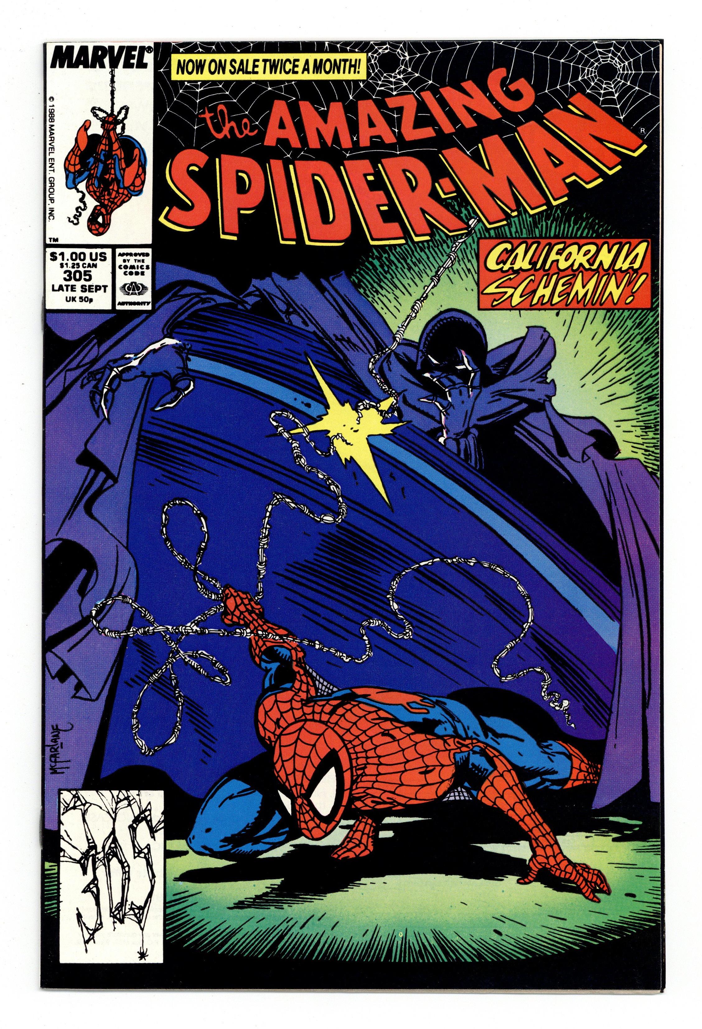 Tags: Marvel Legacy Numbering: Amazing Spider-Man (part 305), Spider-Man$21.00Direct Edition. "Westward Woe!" Part 2 of 2. Guest-starring the Prowler. Script by David Michelinie. Pencils by Todd McFarlane. Inks by Hector Collazo, Chris Ivy, Ken Lopez, Mark McKenna, Rodney Ramos, Pat Redding, and Joe Rubinstein. Cover by Todd McFarlane. In dashing fashion the Black Fox absconds with the precious chalice! And leaves the web-slinger wondering to where he disappeared! But this time there's someone else besides the wall-crawler hunting the fox! The Prowler! Hobie Brown needs the chalice to clear his wife's name in a criminal investigation! The following night at the Long Beach docks; Spider-Man, the Prowler, the Black Fox, and Transcorp's gun-toting goons come together! Who will hoist the cup of victory? Cameo appearances by Johnny Carson and Ed McMahon. (Notes: The Black Fox returns in Amazing Spider-Man 348. The Prowler formerly appeared in Spectacular Spider-Man 47.) 36 pages. Cover price $1.00.