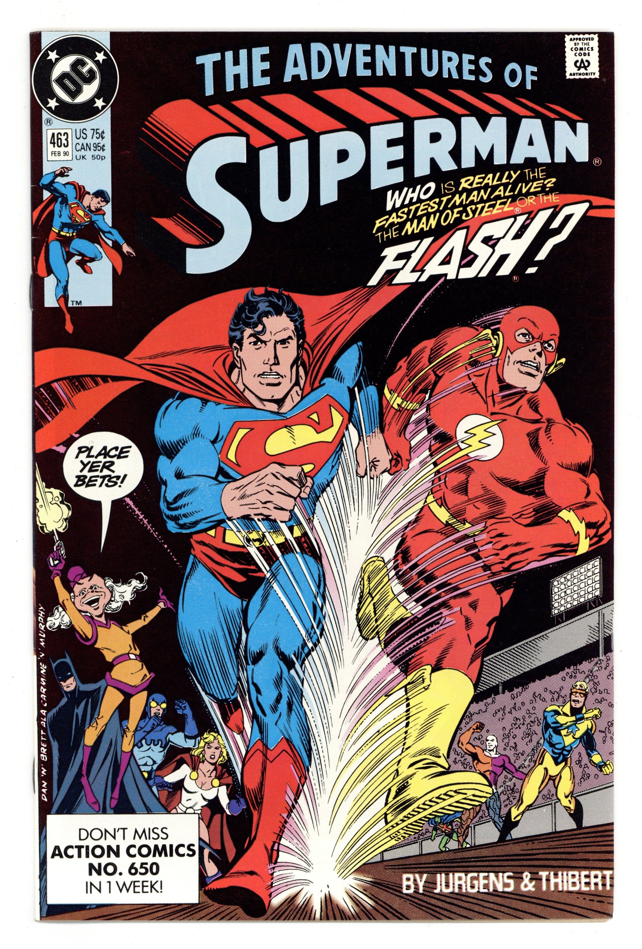 Tags: Superman$20.00Direct Edition. Cover pencils by Dan Jurgens, inks by Brett Breeding. Speed Kills, script by Dan Jurgens, pencils by Dan Jurgens, inks by Art Thibert; Superman versus the Flash, in a race necessary to send Mr. Mxyzptlk back to the fifth dimension for another ninety days. 36 pgs. $0.75. Cover price $0.75.