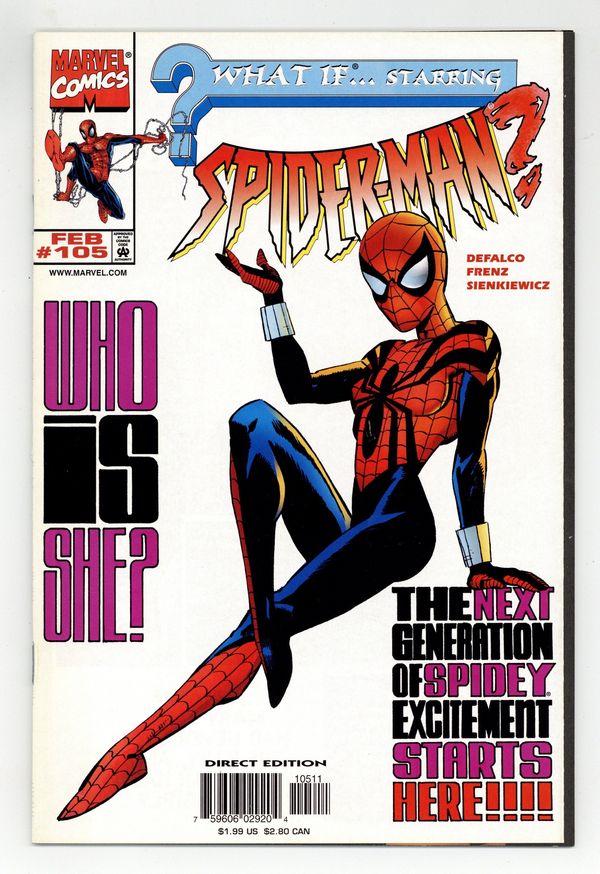 Direct Edition. Legacy...., script by Tom Defalco (Plot and Script) and Ron Frenz (Plot), pencils by Ron Frenz, inks by Bill Sienkiewicz; In the future, the grown Normie Osborn becomes the Greeen Goblin and the daughter of Spider-Man must stop him; introduction and Origin of Spider-Girl. 38 pages, full color. Cover price $1.99.