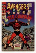 First appearance of the Red Guardian in "Color Him...the Red Guardian!" Part 1 of 2. Script by Roy Thomas. Pencils by John Buscema. Inks by George Roussos (as George Bell). Cover by John Buscema and George Roussos. After receiving a tip concerning the Black Widow's whereabouts, Hawkeye andHercules travel to the Far East to rescue her! But her communist captors have created a super-powered adversary to oppose them: the Red Guardian! Once the Prince of Power and the ace archer arrive in the Middle Kingdom, they defeat the guard force and challenge the Red Guardian! However thecommunist champion is smart and tough! He uses the Psychotron to confuse Hercules -- and next uses his belt weapon to knock out Hawkeye. And then while basking in the glow of his victory, the guardian makes a shocking announcement: Natasha Romanoff is his wife! What a red-letter day for the Red Guardian! Avengers Lineup: Captain America, Goliath, Hawkeye, Hercules, Quicksilver, Scarlet Witch, and the Wasp. (Note: This story was reprinted in Marvel Triple Action #35.) 36 pages. Cover price $0.12.