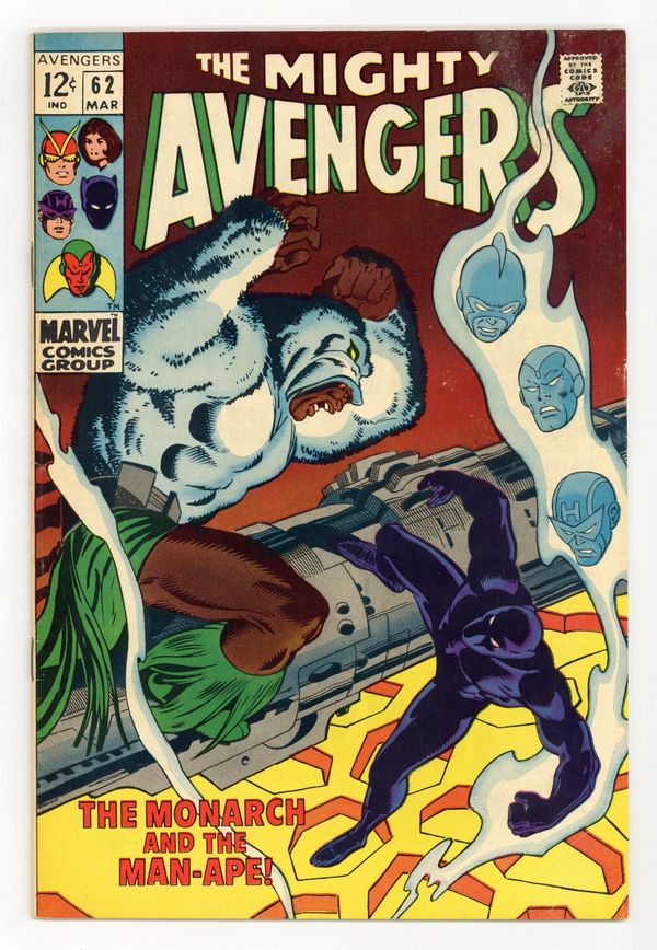 "The Monarch and the Man-Ape" First appearance of the Man-Ape. Script by Roy Thomas. Pencils by John Buscema. Inks by George Klein. Cover by John Buscema and George Klein. After their encounter with Ymir and Surtur, the Avengers travel to the Black Panther's homeland to recuperate! But unfortunately there is something rotten in the state of Wakanda! M'Baku, one of T'Challa's mightiest warriors, has usurped the throne and secretly taken on the identity of the Man-Ape! However, the Avengers don't know that when they sit down for the evening feast! Once his teammates succumb to M'Baku's drugged wine, the Black Panther must face his royal challenger alone! In the heart of the jungle, T'Challa battles for his throne and his life vs. the ferocious Man-Ape! Appearance by the Black Knight. Avengers Lineup: Black Panther, Hawkeye, and the Vision. (Notes: The Man-Ape returns in Avengers 78. The cover logo changes to "The Mighty Avengers" thru issue 69. The letters page also contains a statement of ownership: average print run 428,600; average paid circulation 276,951. This story was reprinted in Jungle Action 5.) 36 pages. 12 cent cover price. Cover price $0.12.