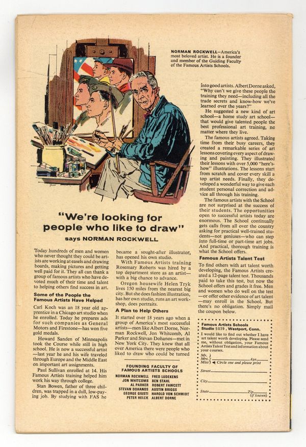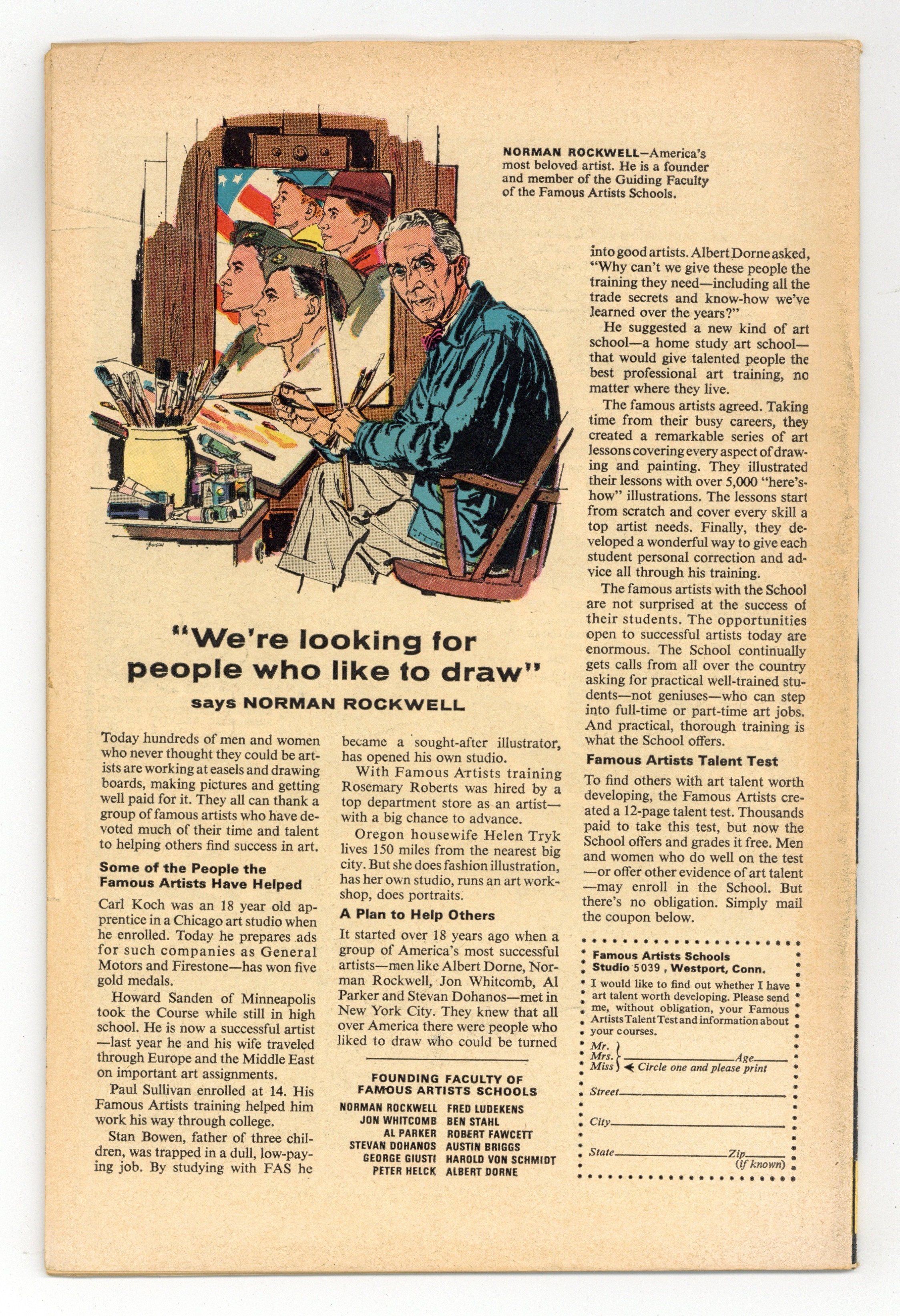 Starts May 11 Cover pencils by Jack Kirby, inks by Frank Giacoia. "Frenzy in a Far-Off Land," script by Stan Lee, pencils by Don Heck, inks by Frank Giacoia; Quicksilver and the Scarlet Witch take a leave of absence from the Avengers due to their dwindling powers; Goliath also sets off to South America to try and find a cure, hearing his old college professor Dr. Anton is there; Black Widow is ordered to destroy the Avengers again with the help of the Swordsman and Power Man; The Avengers find the Black Widow and co. but Hawkeye wants to go alone, as it is personal to him; Meanwhile, Goliath lands in South America and finds Dr. Anton has been captured by the Keeper of the Flame; He tries to save him, but is overwhelmed then brought to safety by Prince Rey, who leads a rebel force against the Keeper; Hawkeye defeats the Swordsman but is trapped by Power Man; The Black Widow saves him, finding herself unable to harm Hawkeye as she loves him; Captain America and the Wasp leave to help Goliath. Avengers roll call: Captain America, Hawkeye, Goliath, the Wasp, and, briefly, Quicksilver and the Scarlet Witch. 36 pgs., full color. $0.12. Cover price $0.12.