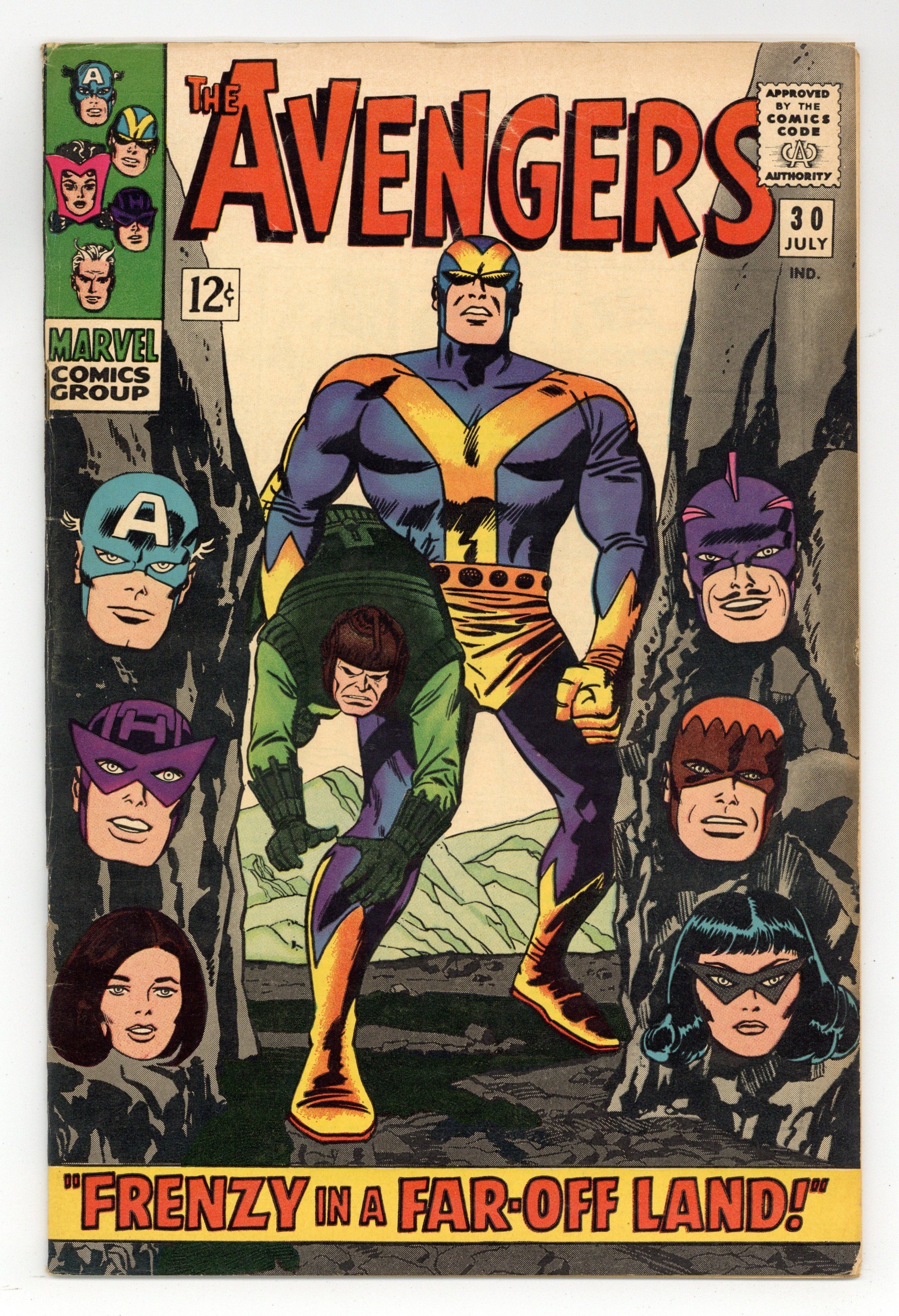 Tags: Marvel Legacy Numbering: Avengers (part 30), Avengers$19.50Cover pencils by Jack Kirby, inks by Frank Giacoia. "Frenzy in a Far-Off Land," script by Stan Lee, pencils by Don Heck, inks by Frank Giacoia; Quicksilver and the Scarlet Witch take a leave of absence from the Avengers due to their dwindling powers; Goliath also sets off to South America to try and find a cure, hearing his old college professor Dr. Anton is there; Black Widow is ordered to destroy the Avengers again with the help of the Swordsman and Power Man; The Avengers find the Black Widow and co. but Hawkeye wants to go alone, as it is personal to him; Meanwhile, Goliath lands in South America and finds Dr. Anton has been captured by the Keeper of the Flame; He tries to save him, but is overwhelmed then brought to safety by Prince Rey, who leads a rebel force against the Keeper; Hawkeye defeats the Swordsman but is trapped by Power Man; The Black Widow saves him, finding herself unable to harm Hawkeye as she loves him; Captain America and the Wasp leave to help Goliath. Avengers roll call: Captain America, Hawkeye, Goliath, the Wasp, and, briefly, Quicksilver and the Scarlet Witch. 36 pgs., full color. $0.12. Cover price $0.12.