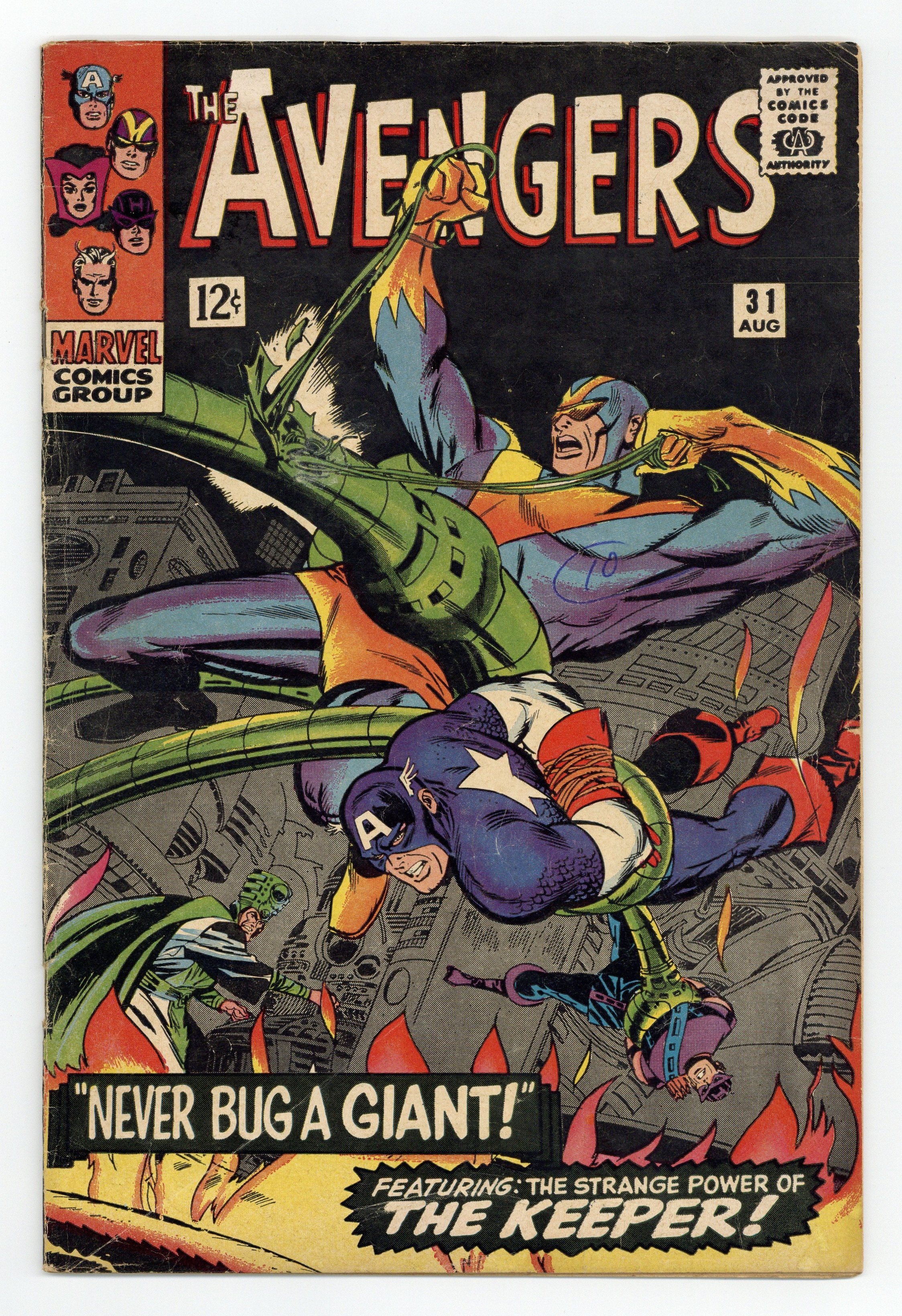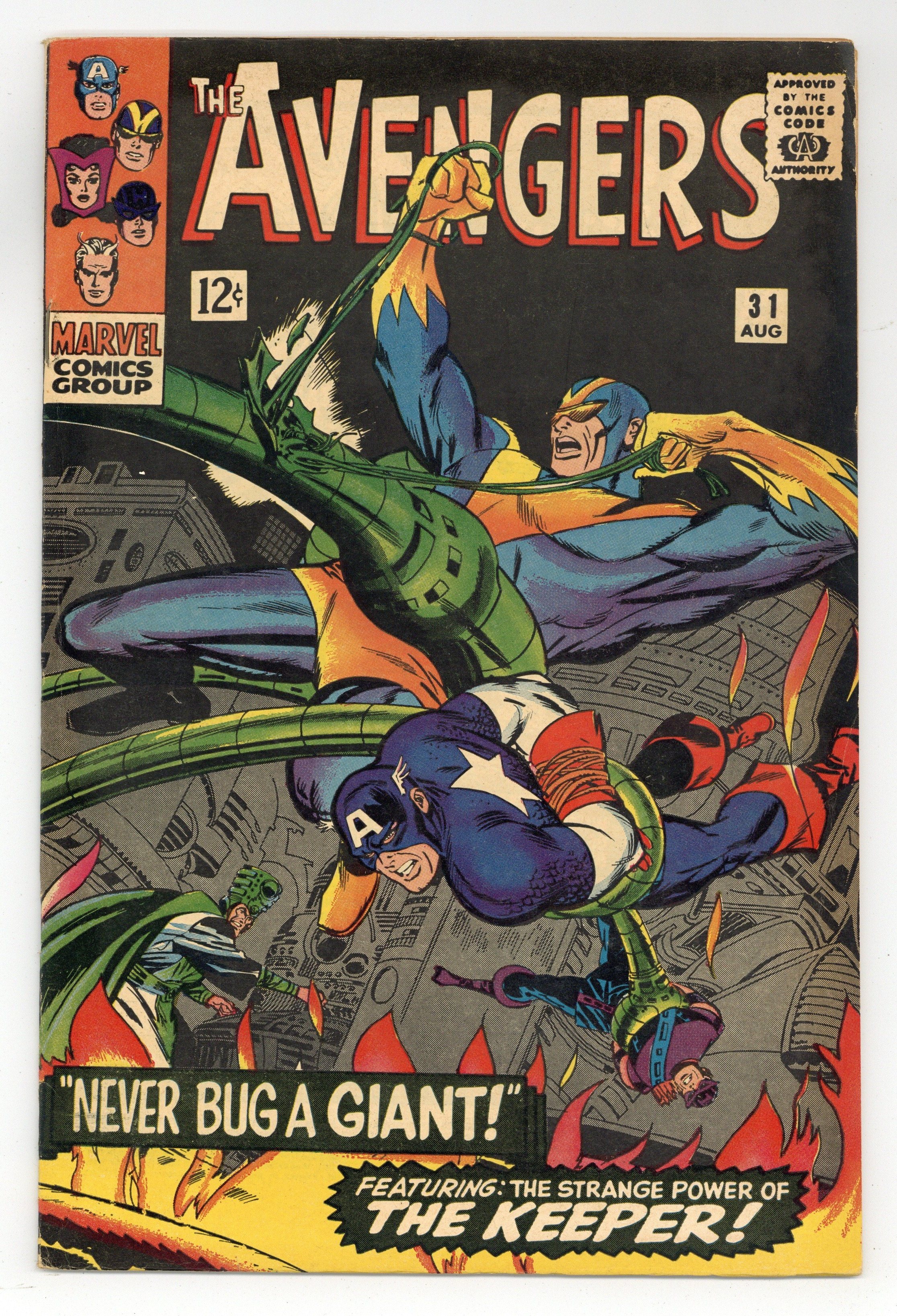 Cover by Don Heck. "Never Bug a Giant!", script by Stan Lee, pencils by Don Heck, inks by Frank Giacoia; Captain America, The Wasp and Hawkeye leave for South America to help Goliath; Meanwhile, Quicksilver and the Scarlet Witch realise how badly they like being Avengers and hope their powers return soon; Goliath and Prince Rey escape to Prince Rey's rebel hideout; He explains how the Keeper controls a powerful cobalt flame, capable of destroying the world; Goliath realizes Prince Rey only wants the flame for his own desires and leaves him; Goliath attacks the Keeper and gets captured; The other Avengers attack and also get captured with the exception of the Wasp; Prince Rey's forces attack the Keeper's, while at the same time, the Wasp frees all the Avengers; Hawkeye smothers the flame with explosive arrows, destroying it. Avengers roll call: Captain America, Hawkeye, Goliath, the Wasp, and, briefly, Quicksilver,and the Scarlet Witch. Reprinted in Giant-Size Marvel Triple Action #1. 36 pgs., full color. $0.12. Cover price $0.12.