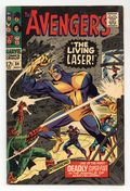 First appearance of the Living Laser in "The Living Laser!" Part 1 of 2. Script by Stan Lee. Art by Don Heck. Cover by Don Heck. A new super-villain bursts on the scene! And he's using -- light amplification by stimulated emission of radiation -- as his primary weapon! After robbing a bank, Arthur Parks (aka the Living Laser) has a chance encounter with Janet van Dyne...and he is immediately smitten by her beauty. But the Living Laser's attraction to the Wasp is twisted -- and he attacks Goliath in order to eliminate him from Jan's life! Hank Pym defeats the Living Laser, and itseems like the episode is over. However Arthur Parks escapes and begins a new crime spree across the city! So now the Avengers have to find and defeat the Living Laser again! Cameo appearance by Dr. Bill Foster. Avengers Lineup: Captain America, Goliath, Hawkeye, and the Wasp. (Notes: This story completes Stan Lee's excellent scripting run on the Avengers title -- which began with issue #1 in 1963. This story was reprinted in Marvel Triple Action #26.) 36 pages. Cover price $0.12.