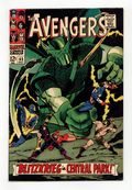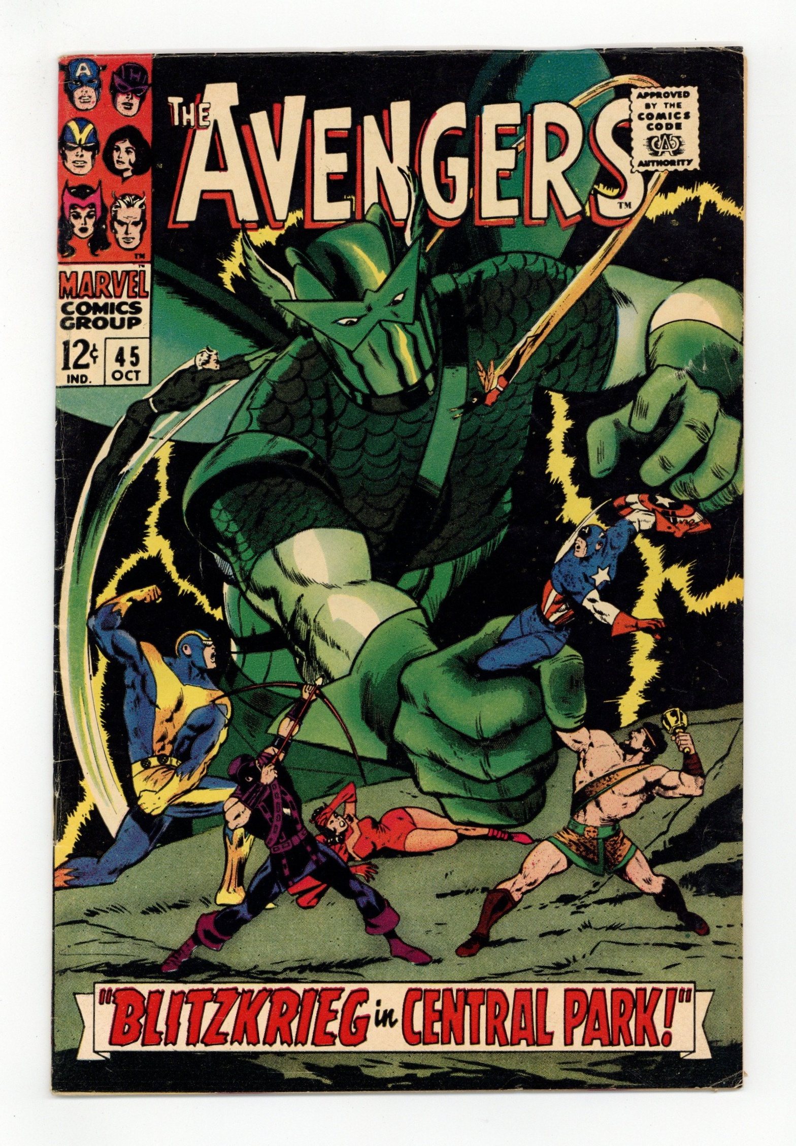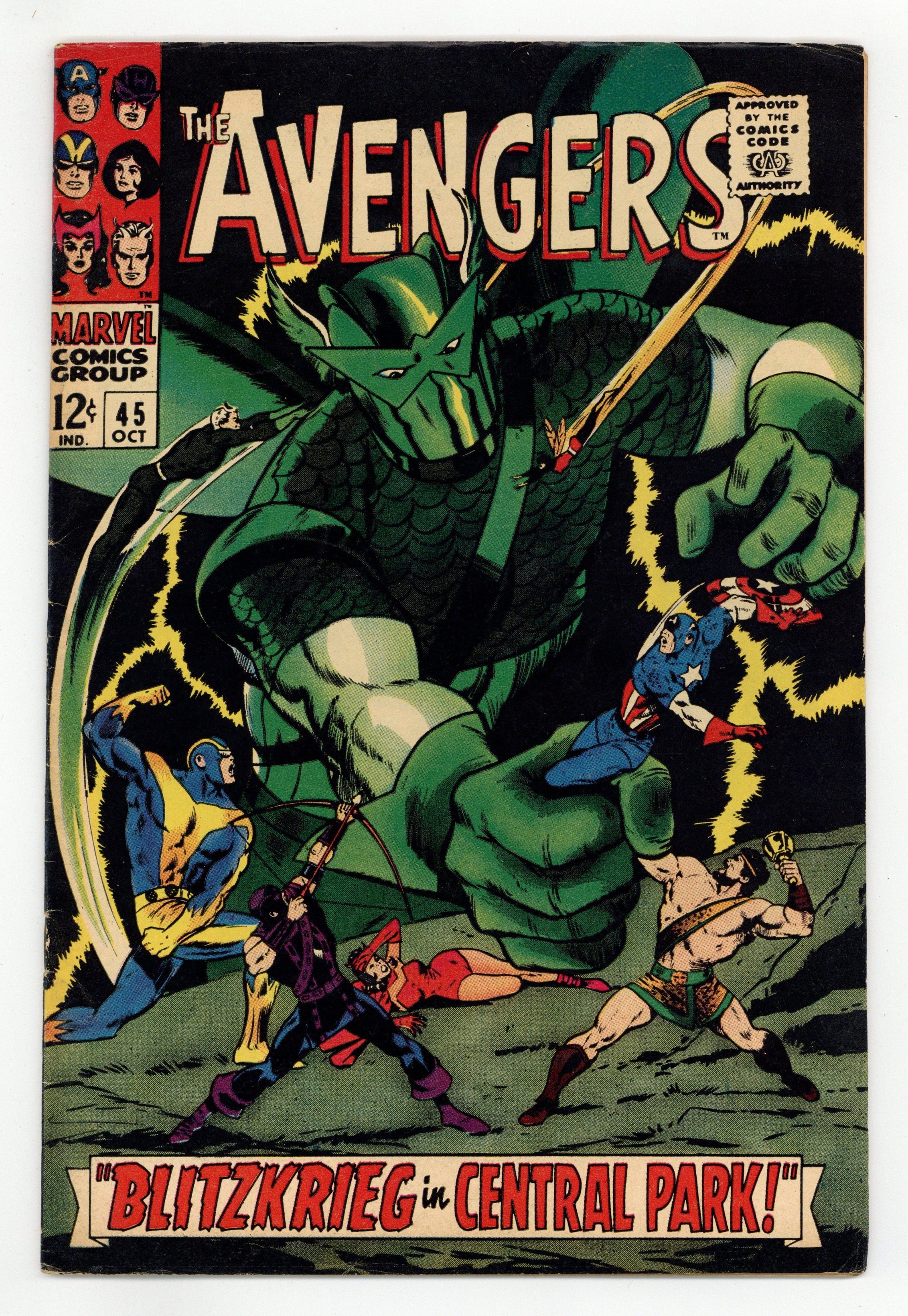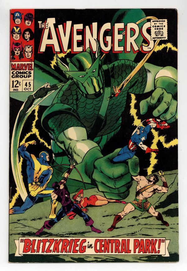 Tags: Marvel Legacy Numbering: Avengers (part 45), Avengers$28.50"Blitzkrieg in Central Park!" Script by Roy Thomas. Pencils by Don Heck. Inks by Vince Colletta. Cover by John Buscema and Vince Colletta. Following Earth's Mightiest Heroes' victory in Avengers Annual #1, the city hosts "Avengers Day" in Central Park! And what a grand celebration it is as nine avengers gather to receive accolades from the crowd. However, there is one person in the crowd -- actually one android in the crowd -- who has not come to praise the Avengers, but to bury them! When the moment is right, the Super-Adaptoid attacks! A.I.M.'s finest creation -- with his array of mimicked powers -- keeps the assembled avengers off-balance. But the adaptoid's obsession with killing the star-spangled avenger provides the heroes with an opportunity to regroup! And Pietro comes up with an idea! Will Quicksilver's quick plan short-circuit the Super-Adaptoid? Avengers Lineup: Captain America, Goliath, Hawkeye, Hercules, Iron Man, Quicksilver, Scarlet Witch, Thor, and the Wasp. (Notes: The Super-Adaptoid returns in Iron Man (1st series) #49. This story was reprinted in Marvel Triple Action #37.) 36 pages. Cover price $0.12.