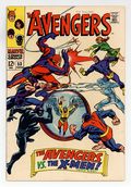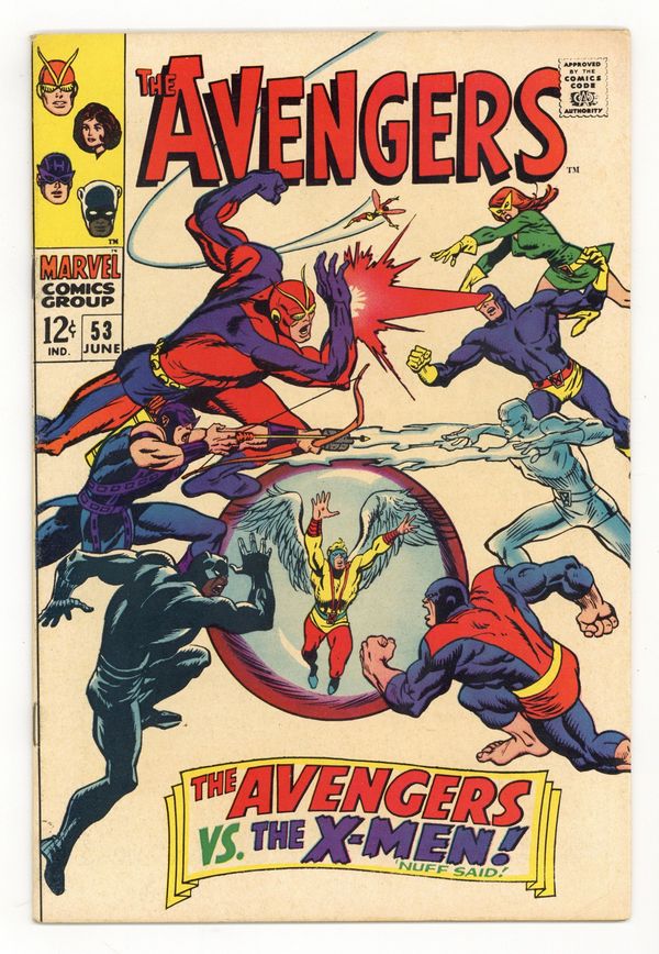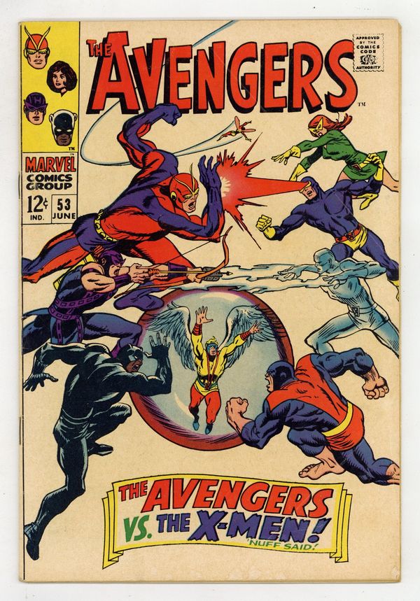 "In Battle Joined!" Guest-starring the X-Men. Script by Roy Thomas.Pencils by John Buscema. Inks by George Tuska. Cover by John Buscema and George Tuska. Story continues from Uncanny X-Men (1963 1st series) #45. After rendezvousing with the Angel, Earth's Mightiest Heroes arrive on Magneto's Atlantic Island ready to take down the Master of Magnetism! However the powerful mutant has a plan to turn the captive X-Men against the Avengers! And in Magneto's lair, Magneto's plan usually works! So it's the Mighty Avengers vs. the Uncanny X-Men for the freedom of the world! Duringthe chaotic battle, Pietro and Wanda look for a way to get off the island! Maybe the Toad will help them! But first he has a surprise for his magnetic master! Avengers Lineup: Black Panther, Goliath, Hawkeye, and the Wasp. X-Men Lineup: Angel, Beast, Cyclops, Iceman, and Marvel Girl. (Notes: Magneto appears next in Uncanny X-Men #62. He battles Earth's Mightiest Heroes again in Avengers 110 & 111. Quicksilver and the Scarlet Witch appear next in Amazing Spider-Man #71. They return to the team in Avengers #75. This story was reprinted in Marvel Triple Action #46 and also in Avengers 350.) 36 pages. Cover price $0.12.
