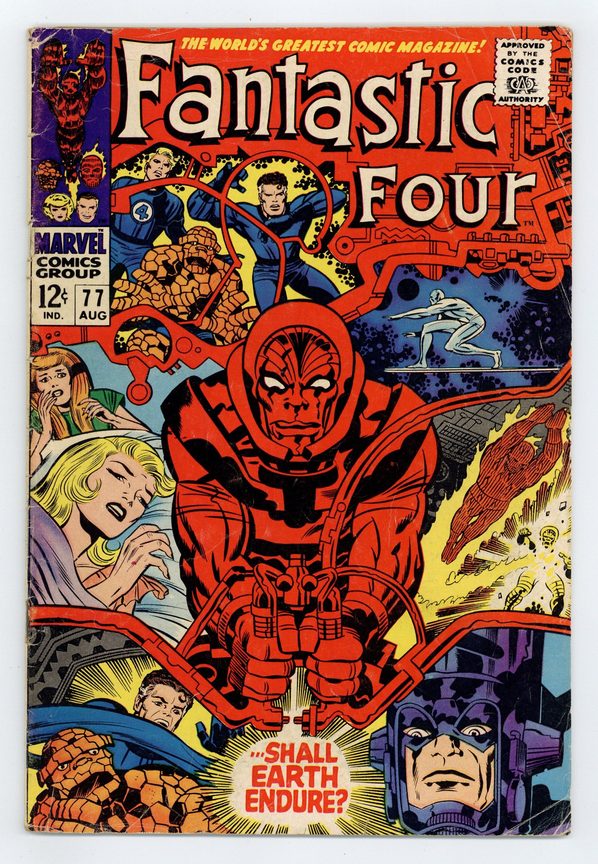 Cover pencils by Jack Kirby, inks by Joe Sinnott. Shall Earth Endure?, script by Stan Lee and Jack Kirby (co-plot), pencils by Jack Kirby, inks by Joe Sinnott; Reed, Ben, and Johnny battle Psycho-Man in the Microverse. Letter to the editor from comics writer Tony Isabella. Reprinted in Marvel's Greatest Comics # 59. 36 pgs. $0.12. Cover price $0.12.