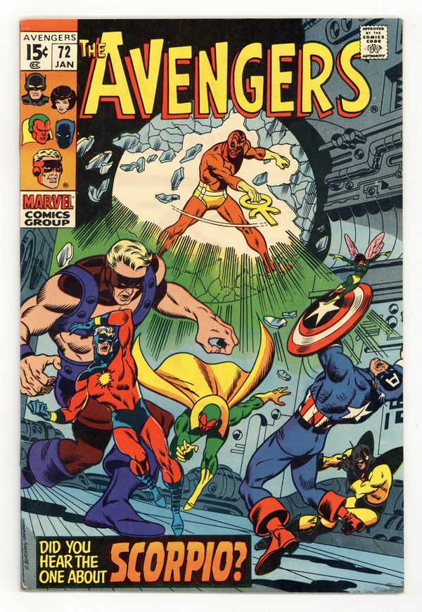 Tags: Marvel Legacy Numbering: Avengers (part 72), Avengers$39.00"Did You Hear the One About Scorpio?" Guest-starring Captain Marvel and Nick Fury. Script by Roy Thomas. Pencils by Sal Buscema. Inks by Sam Grainger. Cover by Sal Buscema and Sam Grainger. Captain America calls a late-night meeting at Avengers Mansion! Three New York City officials have been kidnapped in recent days by Scorpio! And the disappearances are connected somehow to SHIELD and Nick Fury! Rick Jones tries to provide some answers at the meeting, but in stunning fashion Scorpio cuts down Rick and the Avengers with one powerful blast from the zodiac key! After the quintet of avengers are taken to Scorpio's hideaway, they come face-to-face with the twelve houses of the Zodiac! And shortly thereafter the no-holds-barred battle begins! The Avengers vs. the Zodiac! Can Earth's Mightiest Heroes defeat the celestial super-villains? Perhaps the stars will be aligned for victory! First appearances of the Zodiac, Libra, and Taurus (aka Cornelius Van Lunt). Cameo appearance by Dum Dum Dugan. Flashback cameo by Jake Fury. Avengers Lineup: Captain America, Goliath, Vision, Yellowjacket, and the Wasp. (Notes: Elements of the story from Nick Fury Agent of Shield 15 continue in this issue. The Avengers battle the Zodiac again in Avengers 120. The letters page includes a letter from comics artist Keith Pollard.) 36 pages. Cover price $0.15.