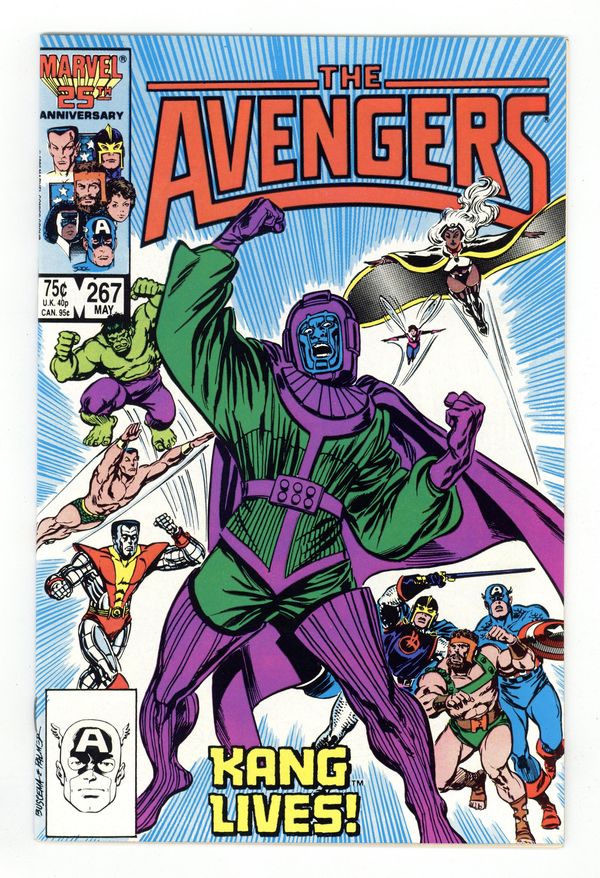 "Time--And Time Again!" Part 1 of 3. Script by Roger Stern. Art by John Buscema (breakdowns) and Tom Palmer (finishes). Cover by John Buscema and Tom Palmer. The Conqueror is back! Wow, where has he been? Or perhaps the better question…When has he been? After a 10-year absence Kang the Conqueror returns to the pages of the Avengers! But it's not just one Kang, it's many Kangs! And rest assured…the Kang from the 41st century (that Earth's Mightiest Heroes know and love) is front and center! Meanwhile in the sub-basements underneath Avengers Mansion, Hercules, the Black Knight, and the Wasp work on boring a new tunnel to Hydro-Base. The tunneling is going great until the Hulk attacks! Then Giant-Man! Then the old Iron Man! It's like a rerun of the battle in Avengers issue 2 vs. the Space Phantom! Who could take the Avengers back in time? Who else, but the Master of Time! Cameo appearances by Iron Man, Storm, Colossus, and President Reagan in an alternate reality. Avengers Lineup: Black Knight, Captain America, Captain Marvel, Hercules, Sub-Mariner, and the Wasp. (Note: Kang previously appeared in the Avengers title in the classic Avengers 143.) 36 pgs. Cover price $0.75.