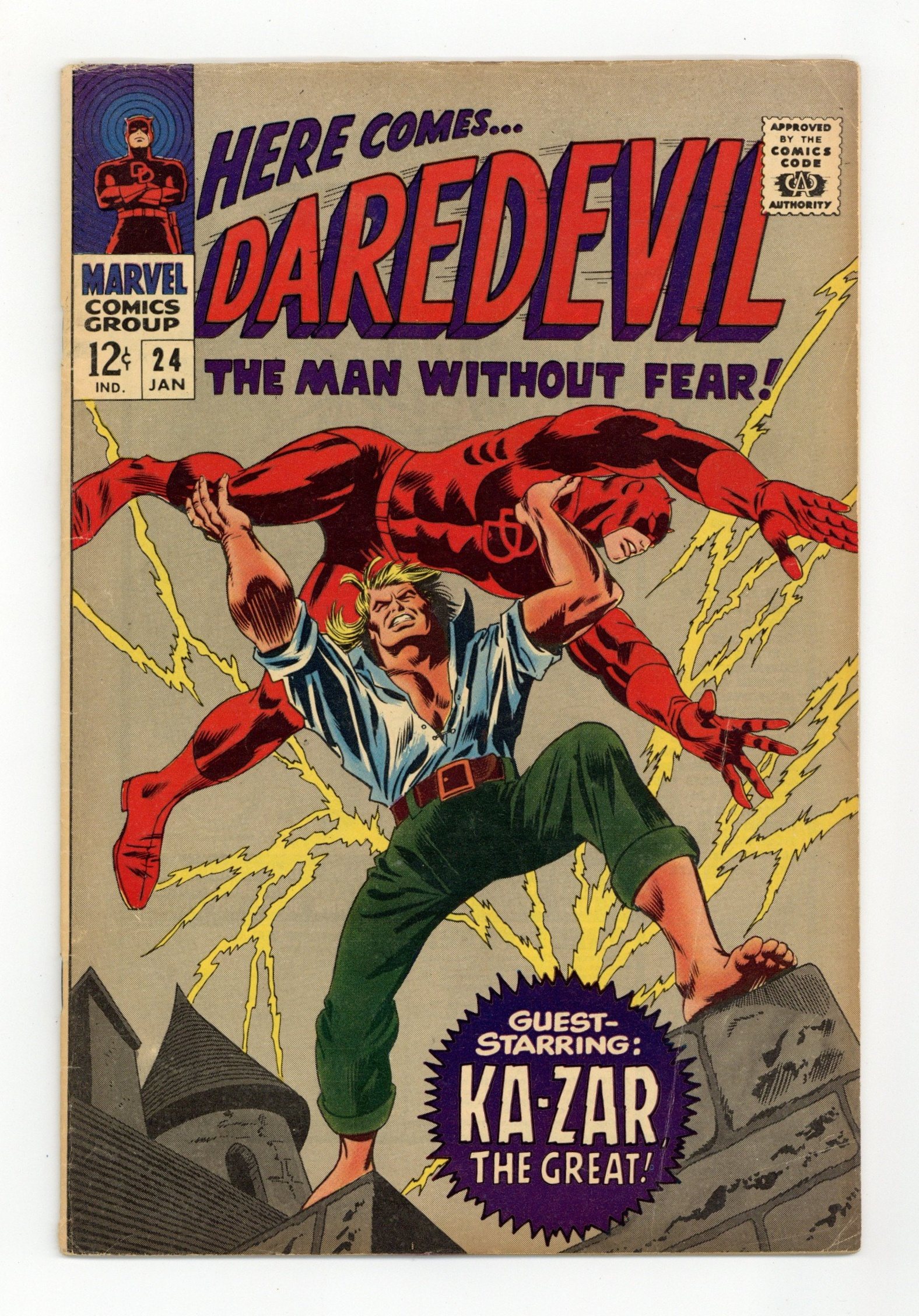 Cover pencils by Gene Colan, inks by Frank Giacoia. The Mystery of the Midnight Stalker, script by Stan Lee, pencils by Gene Colan, inks by Frank Giacoia; DD makes his way to England where he finds that Ka-Zar is accused of being the Midnight Stalker; DD realizes that The Plunderer is trying to frame his brother, and the dynamic duo track him down; In a last panel shocker, Karen opens a letter to Matt from Spider-Man stating that the Web-Slinger knows that he and DD are one and the same. 36 pgs. Cover price $0.12. Cover price $0.12.