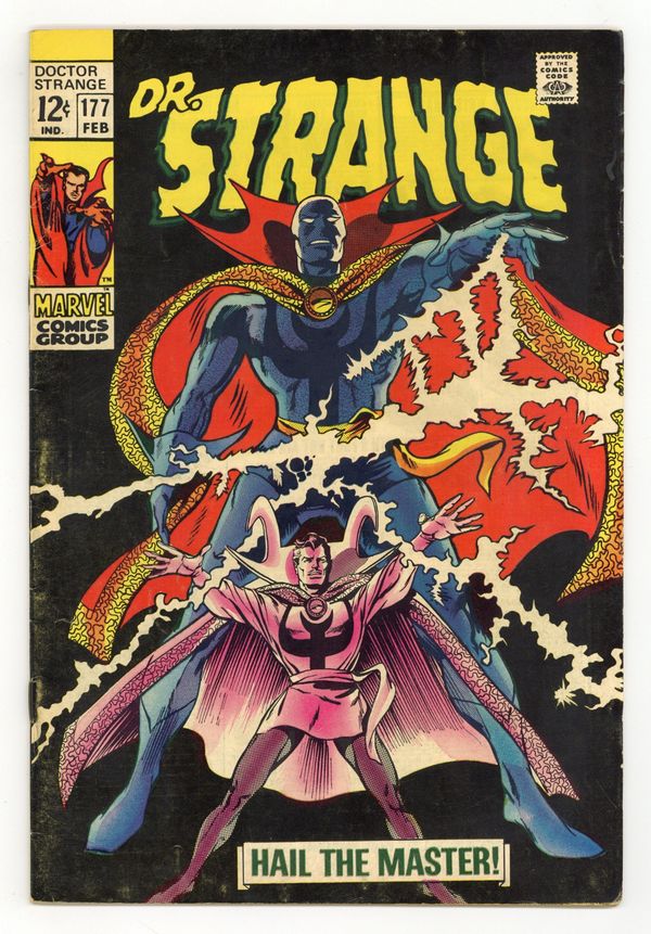Tags: Marvel Legacy Numbering: Doctor Strange (part 177)$20.00Dr. Strange gets a new costume that fans didn't care for in 1969--but it looks pretty cool to us! Cover pencils by Gene Colan, inks by Tom Palmer. The Cult and the Curse, script by Roy Thomas, pencils by Gene Colan, inks by Tom Palmer; Asmodeus assumes form of Dr. Strange, to fool Ancient One; Strange takes on new masked costume. Asmodeus recites the Spell of Fire and Ice with dying breath, releasing Ymir the frost giant and Surtur the fire demon. 36 pgs. $0.12. Cover price $0.12.