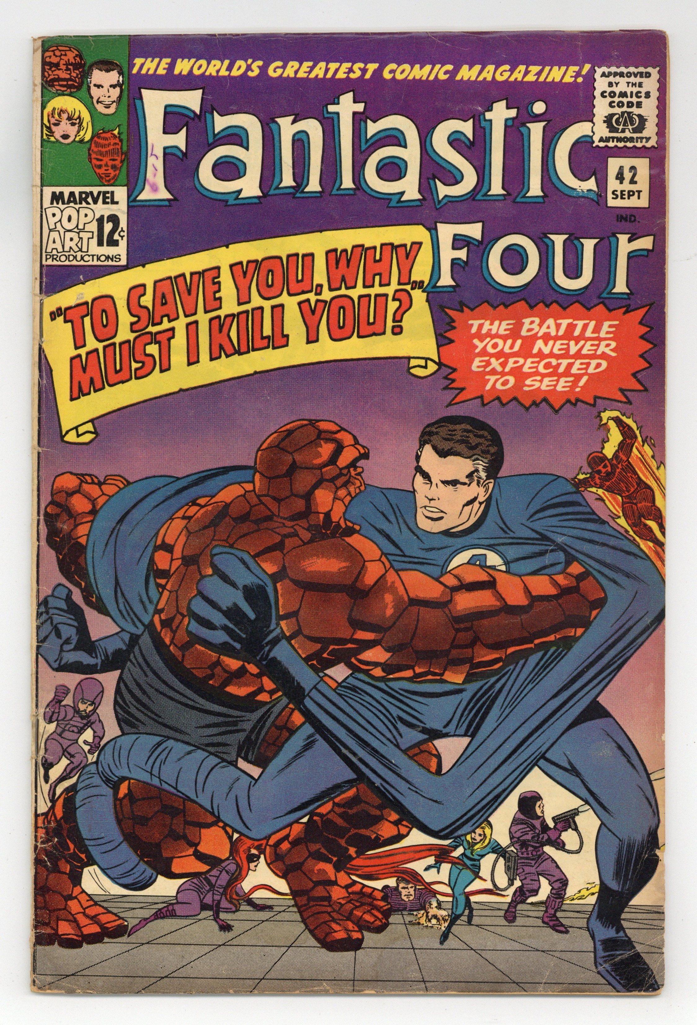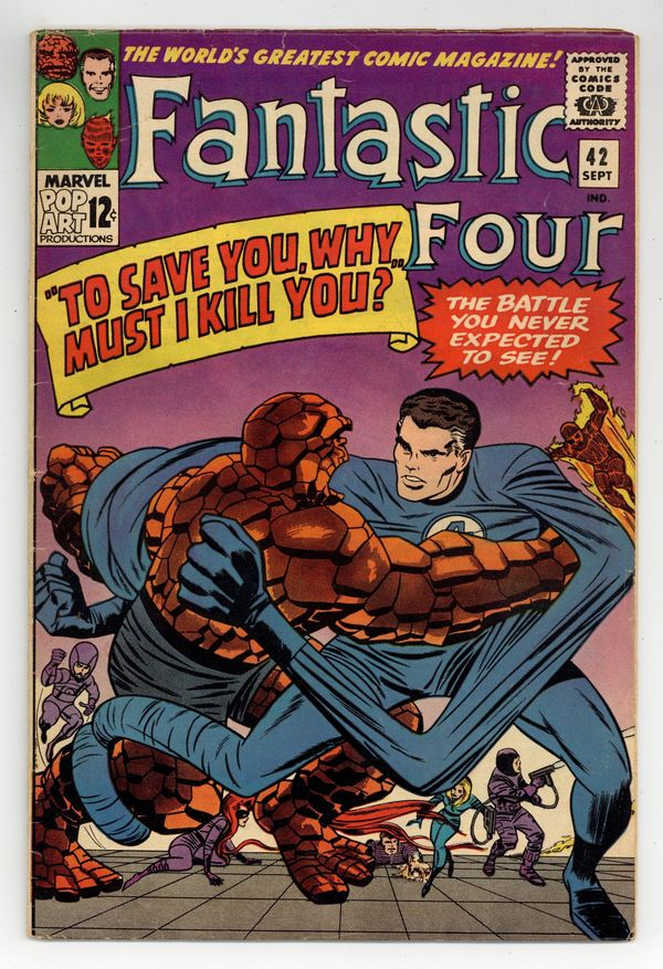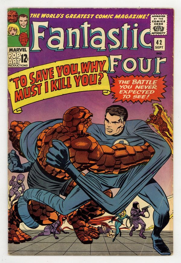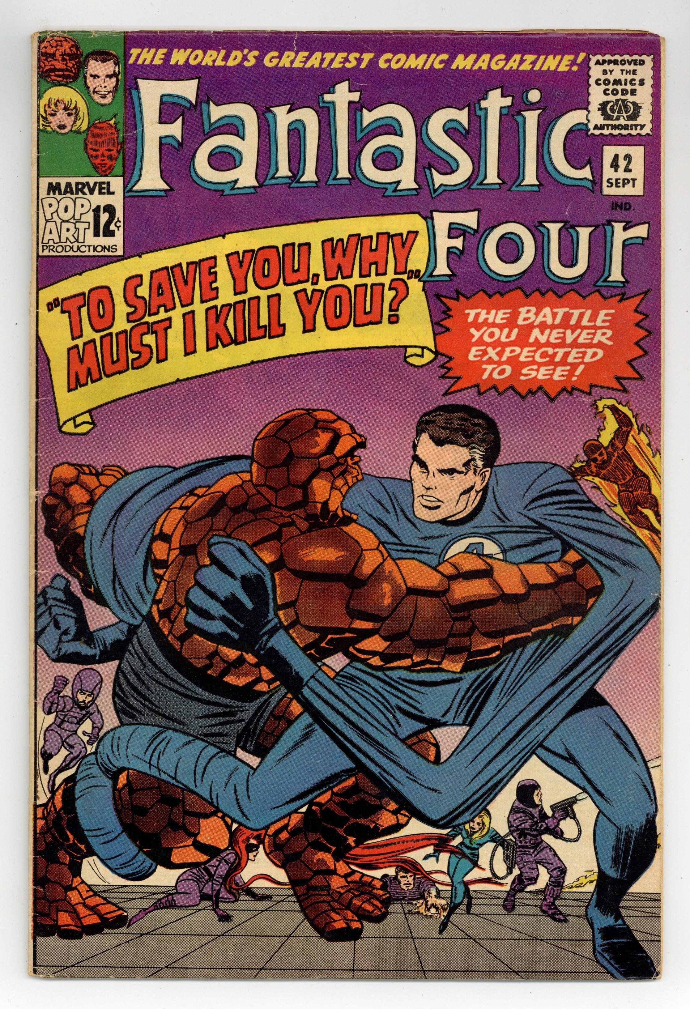 Cover pencils by Jack Kirby, inks by Sol Brodsky. To Save You, Why Must I Kill You, script by Stan Lee, pencils by Jack Kirby, inks by Vince Colletta; The Frightful Four brainwash the Torch and, together with the brainwashed Thing, pursue Reed and Sue. Letter to the editor from comics writer Don McGregor. 36 pgs. $0.12. Cover price $0.12.