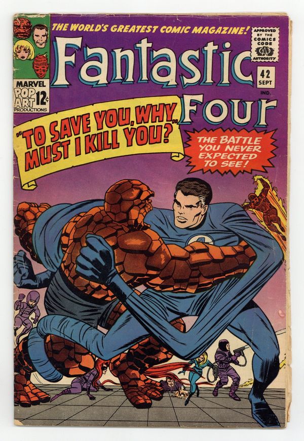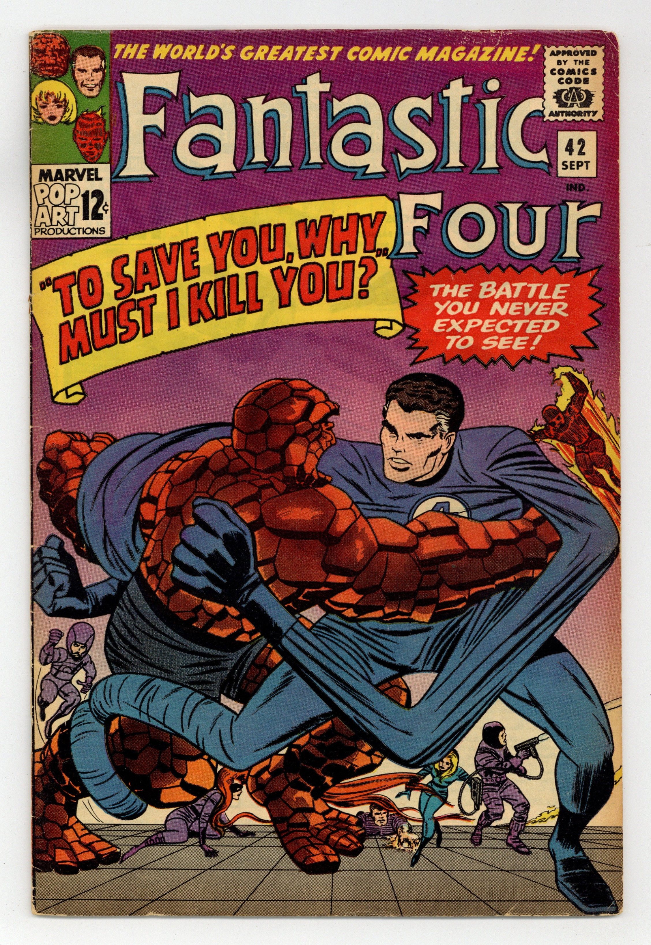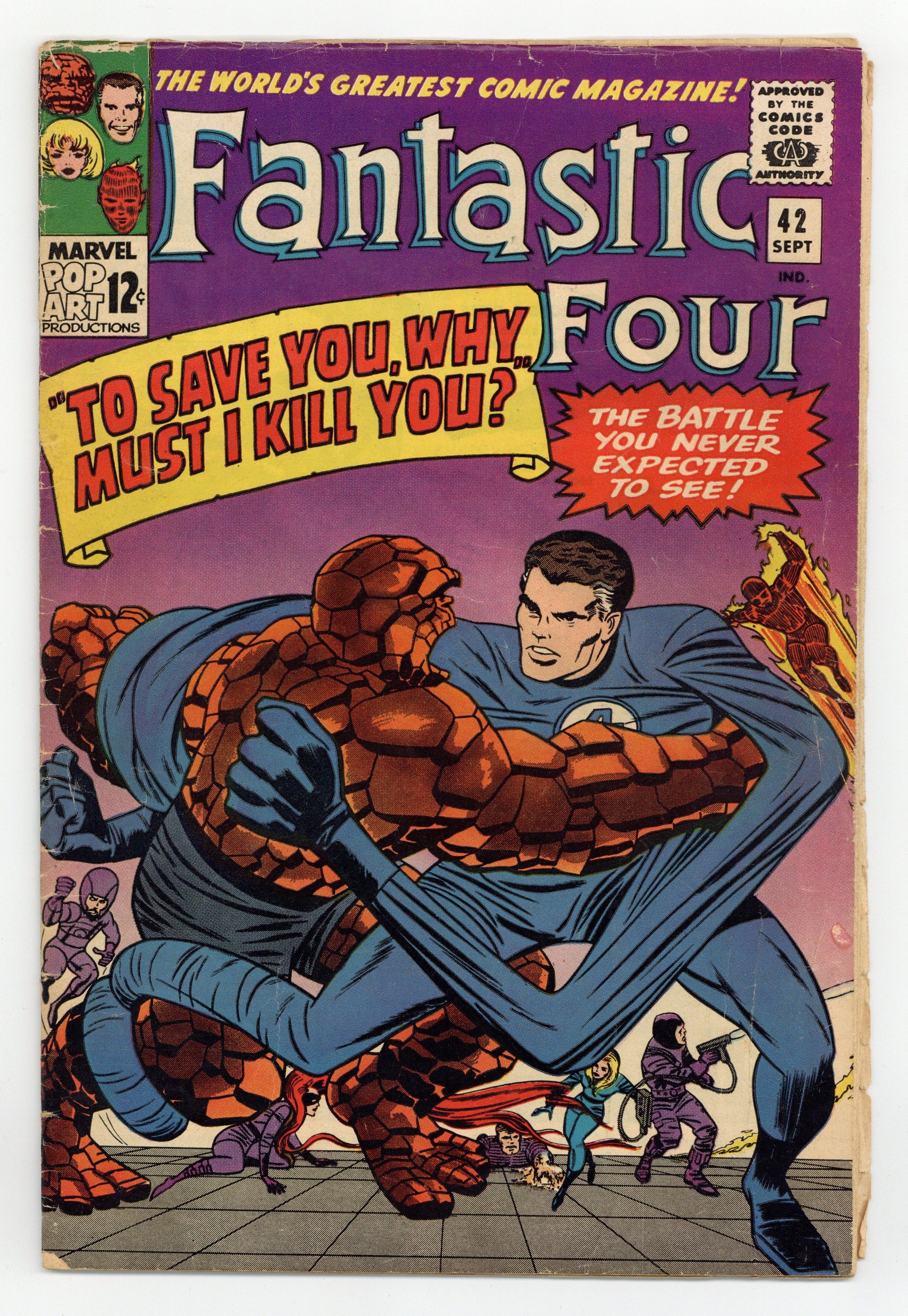 Cover pencils by Jack Kirby, inks by Sol Brodsky. To Save You, Why Must I Kill You, script by Stan Lee, pencils by Jack Kirby, inks by Vince Colletta; The Frightful Four brainwash the Torch and, together with the brainwashed Thing, pursue Reed and Sue. Letter to the editor from comics writer Don McGregor. 36 pgs. $0.12. Cover price $0.12.