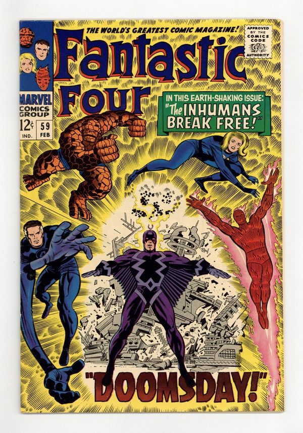 Cover pencils by Jack Kirby, inks by Joe Sinnott. Doctor Doom steals the Silver Surfer's cosmic powers (part 3 of 4) in Doomsday, script by Stan Lee and Jack Kirby (co-plot), pencils by Jack Kirby, inks by Joe Sinnott; Dr. Doom wreaks havoc across the globe with the Power Cosmic; Black Bolt destroys the barrier that was imprisoning the Inhumans. Brief Inhumans appearance. 36 pgs. $0.12. Cover price $0.12.