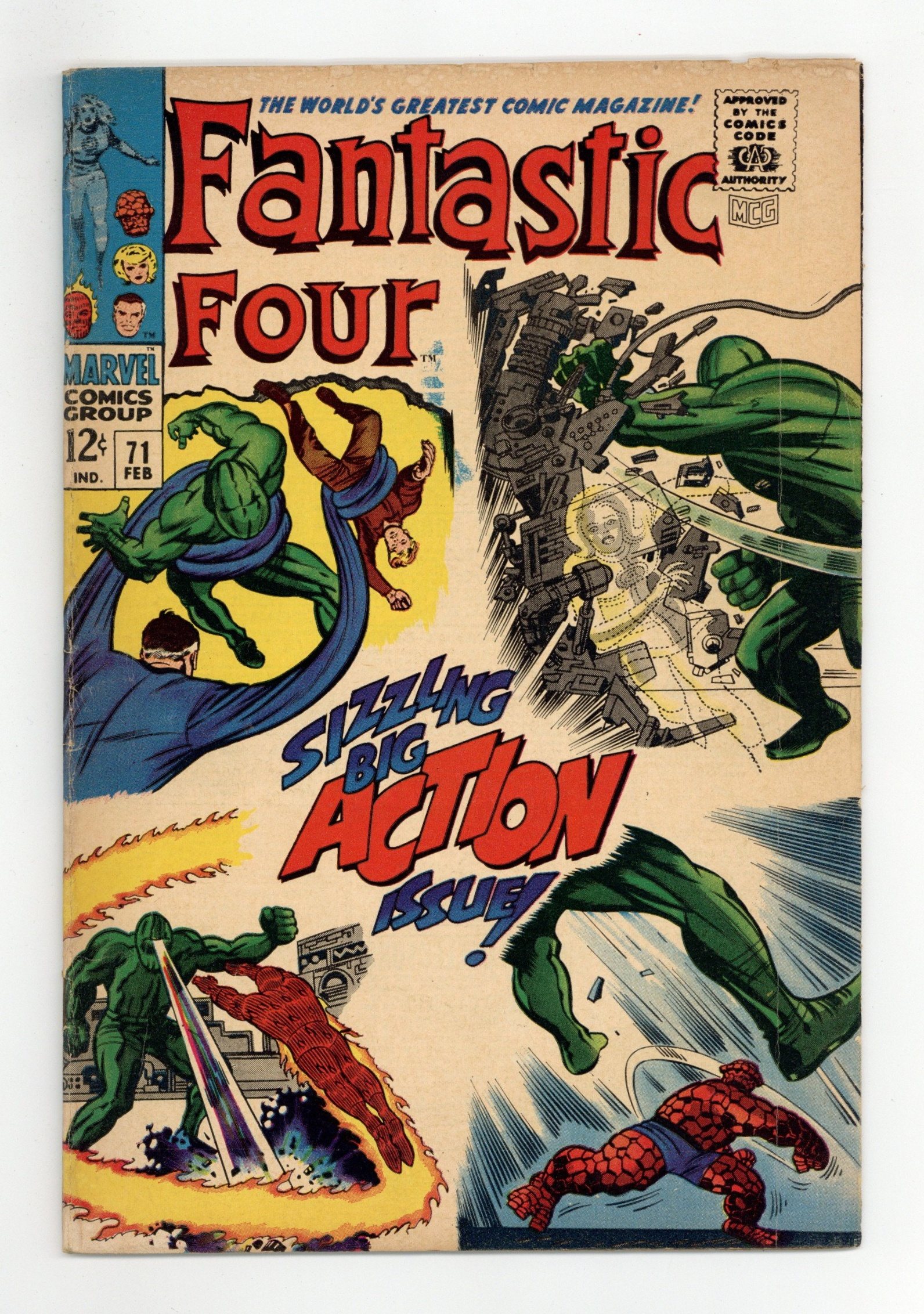 Cover pencils by Jack Kirby, inks by Joe Sinnott. ...and So It Ends..., script by Stan Lee; Jack Kirby (co-plot), pencils by Jack Kirby, inks by Joe Sinnott; Ben, with his mind restored helps the others defeat the Thinker's android. Crystal (of the Inhumans) appearance. 36 pgs. $0.12. Cover price $0.12.