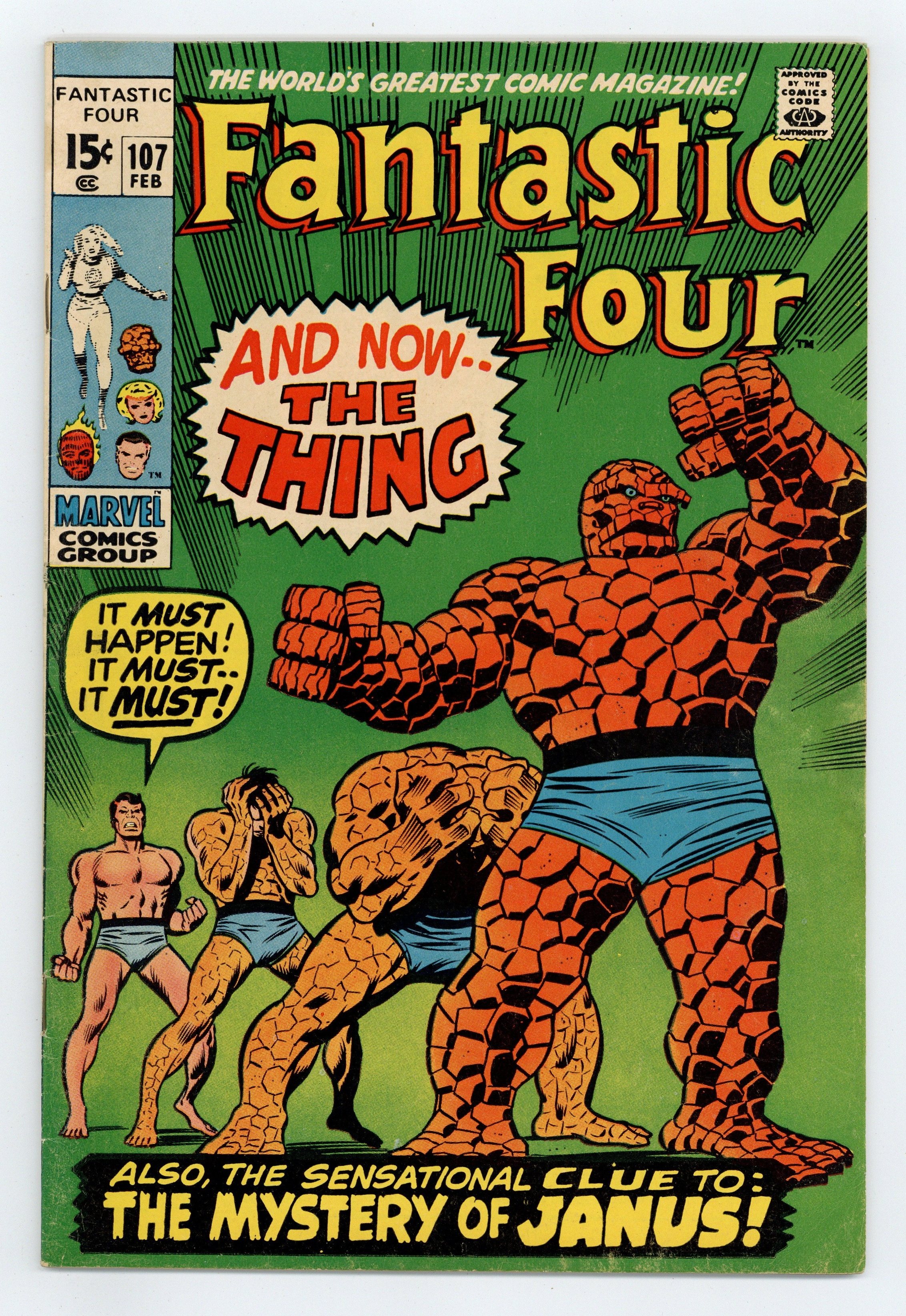 First appearance of Janus in "And Now, the Thing!" Script by Stan Lee. Pencils by John Buscema. Inks by Joe Sinnott. Cover by John Buscema and Joe Sinnott. Reed's experiment to transform the Thing back to Ben Grimm is a huge success! And now Ben can change back and forth from the Thing at anytime! What a happy day for Ben and Alicia! Meanwhile, a man called Janus visits the Baxter Building and asks his former colleague, Reed Richards, for a favor. He would like to journey into the Negative Zone. Is that really a good idea? Cameo appearances by Agatha Harkness and Franklin. Flashback cameo by Annihilus to recap the events of Fantastic Four Annual 6. 36 pages Cover price $0.15.