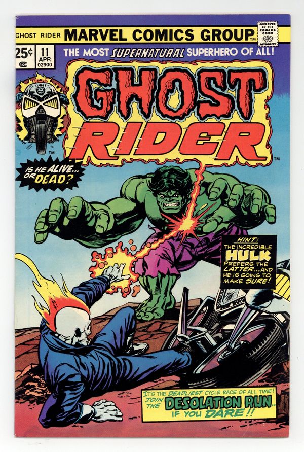"The Desolation Run!" Guest-starring Hulk. Story by Tony Isabella. Art by Sal Buscema and John Tartaglione. Cover by Gil Kane and Klaus Janson. Johnny Blaze participates in a cross-country race, but when the sinister Inferno tricks the Incredible Hulk into attacking Ghost Rider all hell breaks loose! NOTE: Marvel Value Stamp series A #66: General Ross. Cover price $0.25.