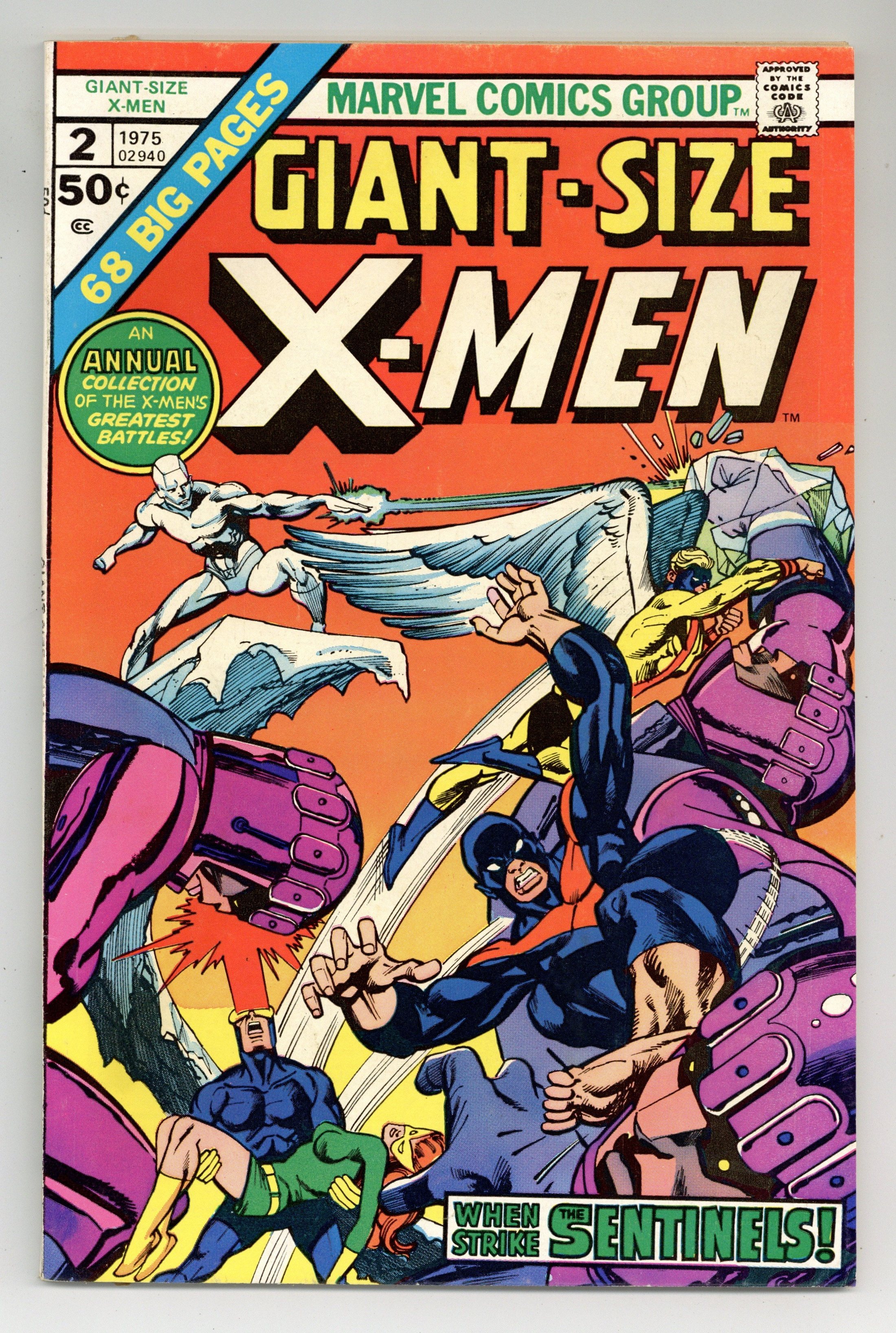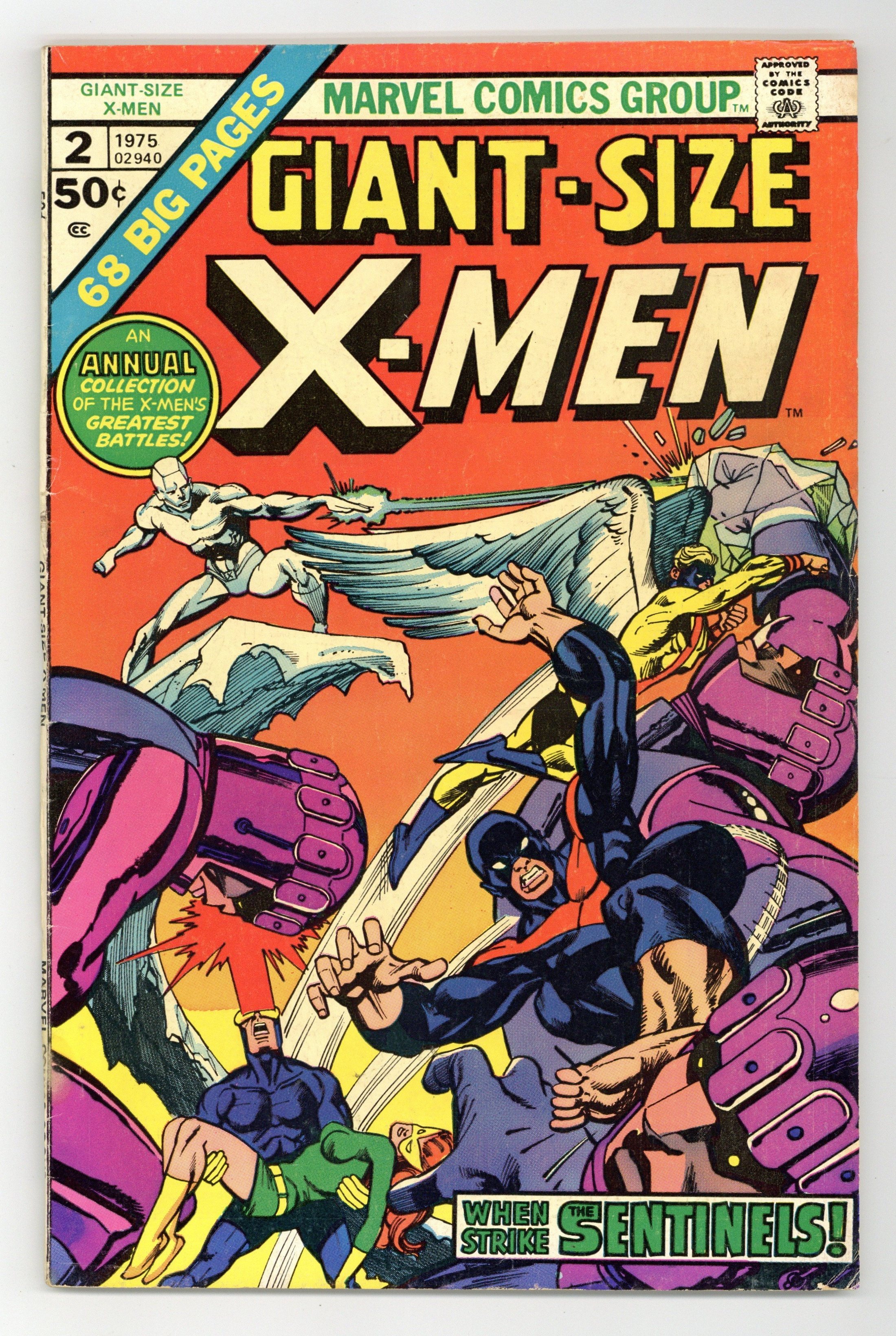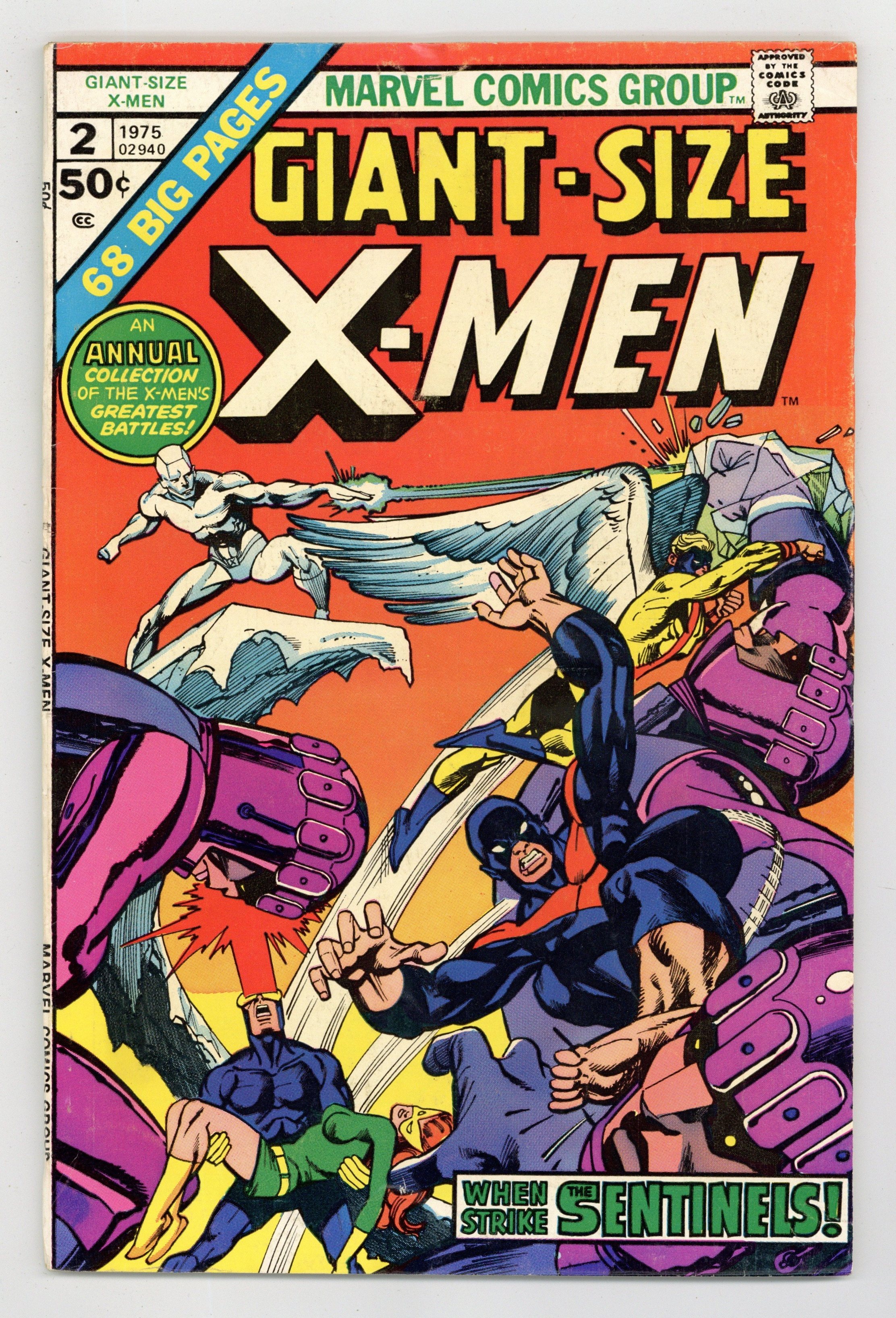 This issue reprints X-Men stories "The Sentinels Live!" (from Uncanny X-Men 57), script by Roy Thomas, pencils by Neal Adams, inks by Tom Palmer. Lorna is attacked by a Sentinel; Alex is paralyzed by his terrible and destructive new powers as the X-Men try to figure out how to help him; The Egyptian authorities arrive and the Living Pharaoh tells them to arrest the X-Men for the destruction of an ancient temple; Alex takes off in the conflict and is attacked by a Sentinel. Learning of the attack on Lorna, Iceman and Beast head back to the states to investigate. "Mission: Murder!" (from UXM 58), script by Roy Thomas, pencils by Neal Adams, inks by Tom Palmer. Sentinels attack Beast and Iceman and Bobby sacrifices himself so that Hank can escape; Angel flies back to the states with Cyclops and Jean following close behind; Iceman is taken to Trask's Sentinel base where he meets up with Lorna and Alex, now called Havok with a containment suit built by Trask. "Do or Die, Baby!" (from UXM 59), script by Chris Claremont and Roy Thomas, pencils by Neal Adams, inks by Tom Palmer. With Larry Trask revealed to be a mutant, the Sentinels refuse to obey him any more as they continue to capture mutants and prepare to kill them; Cyclops, Jean and Beast mount an offensive to rescue their captured friends; Cyclops, Jean and Hank disguise themselves as Quicksilver, Scarlet Witch and Toad as they battle the Sentinels. Four-and-a-half pages of the original stories are excised for this reprint edition. 68 pgs., full color. Cover price $0.50.