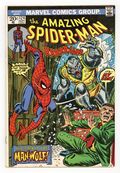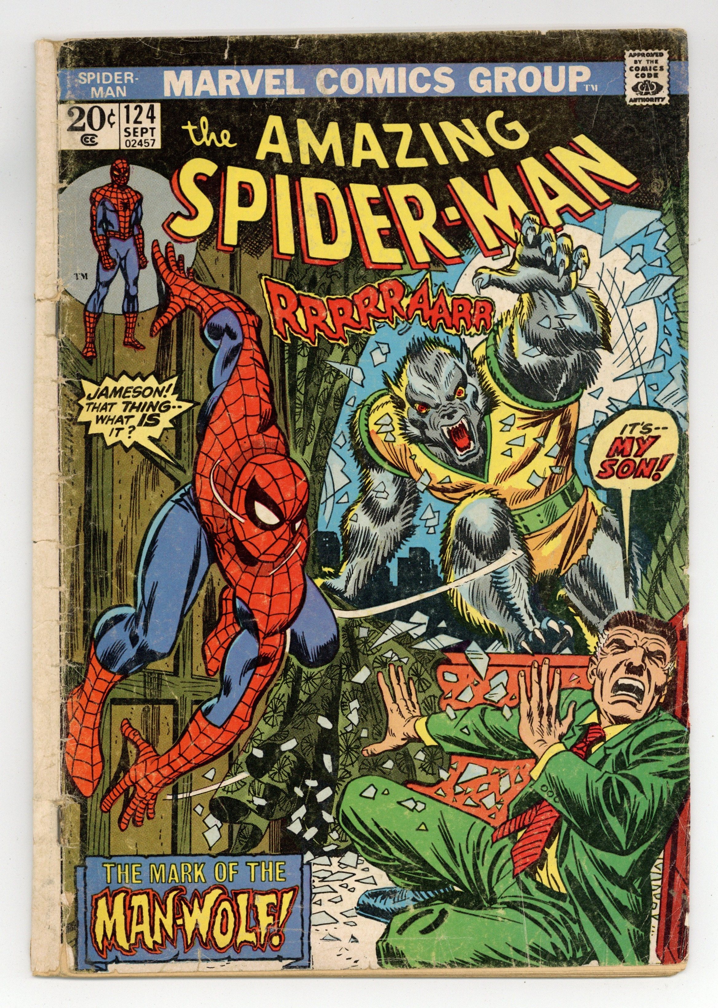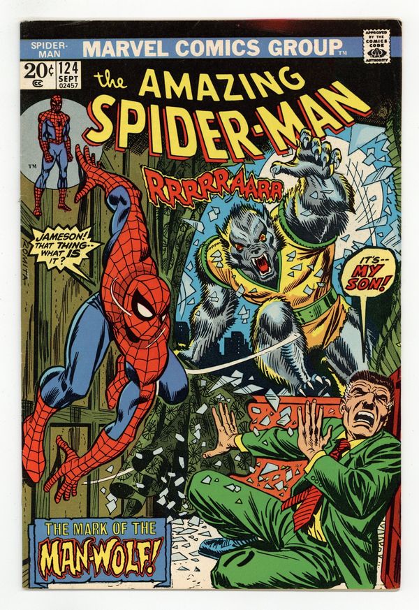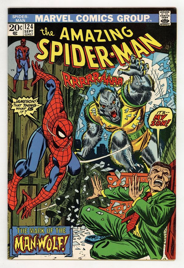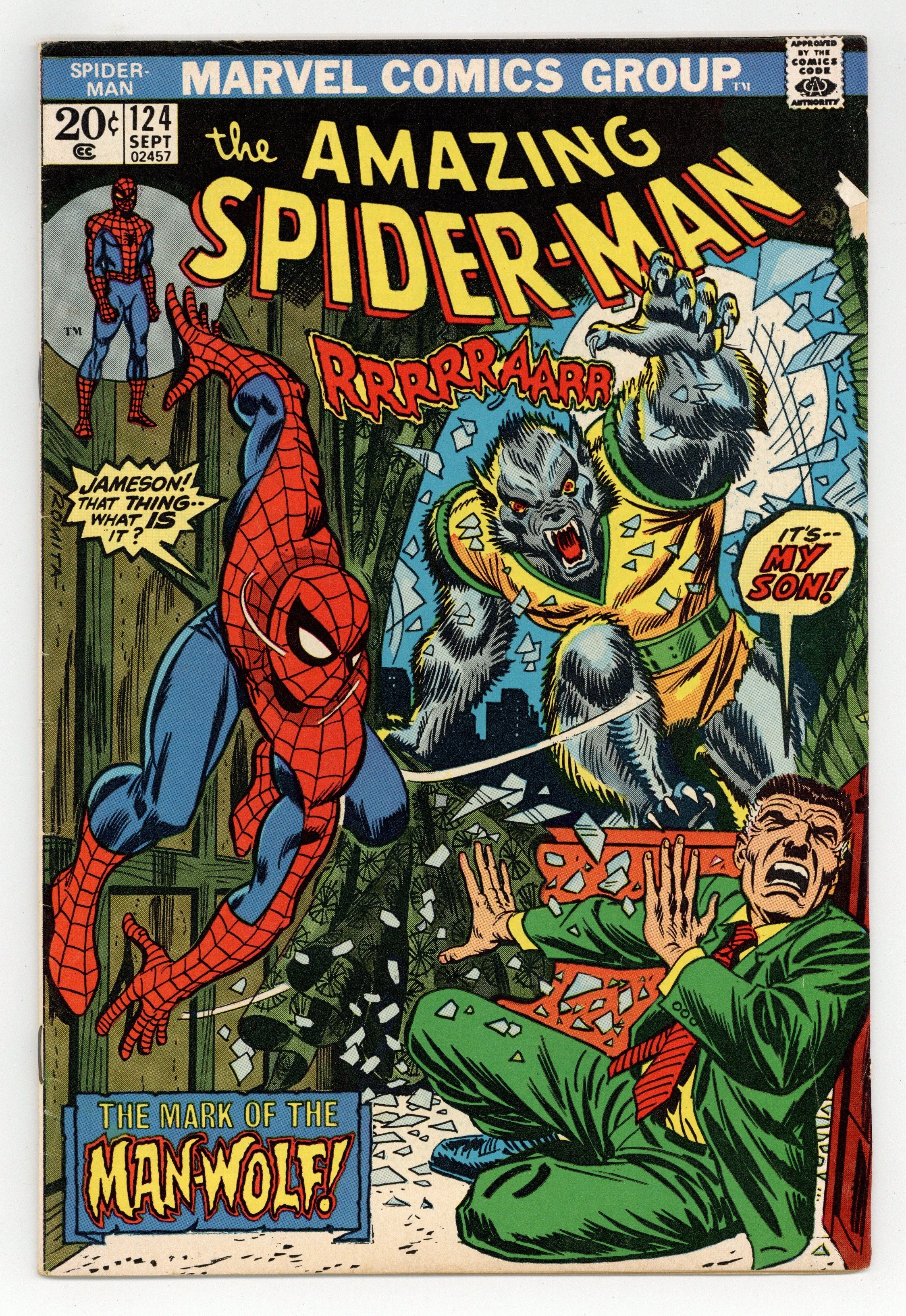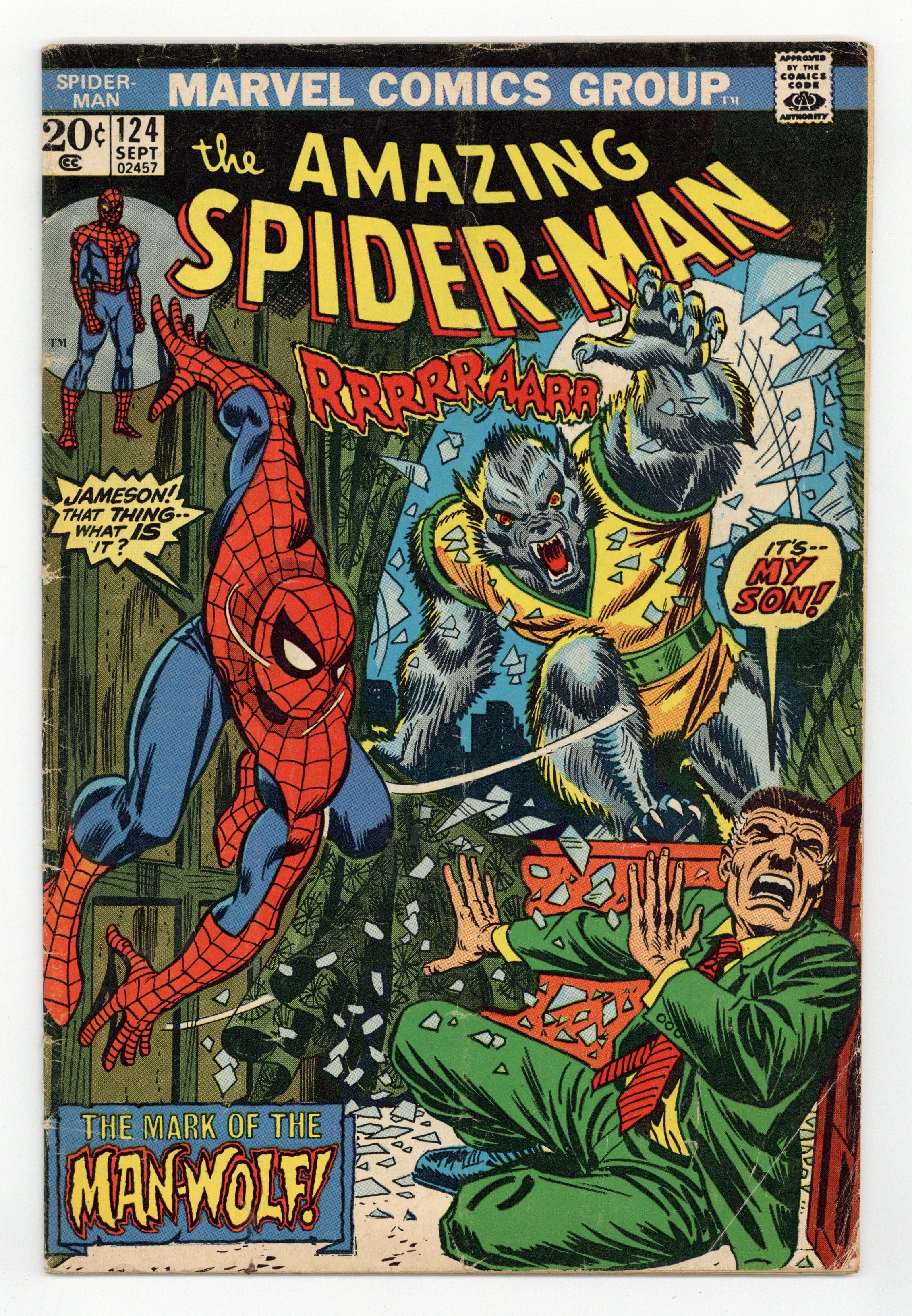 Tags: Marvel Legacy Numbering: Amazing Spider-Man (part 124), Spider-Man$99.00First appearance of the Man-Wolf (aka John Jameson) in "The Mark of the Man-Wolf" Part 1 of 2. Script by Gerry Conway. Pencils by Gil Kane. Inks by John Romita and Tony Mortellaro (backgrounds). Cover by John Romita. While web-swinging through the city, Spider-Man stops to look at the local newspapers. He becomes angry when the Daily Bugle is the only newspaper calling him a murderer -- in connection with the death of Norman Osborn! The livid wall-crawler rushes to JJJ's apartment, but someone else gets their first: the Man-Wolf! Oh my! As shown on the terrific cover, Spider-Man battles the Man-Wolf to save J. Jonah Jameson! First appearance of Kristine Saunders. Cameo appearances by Mary Jane Watson, Flash Thompson, and Joe Robertson. (Notes: In the letters page, the web-slinger's fans react to Gwen Stacy's death. This story was reprinted in Marvel Tales 101.) 36 pages. Cover price $0.20.