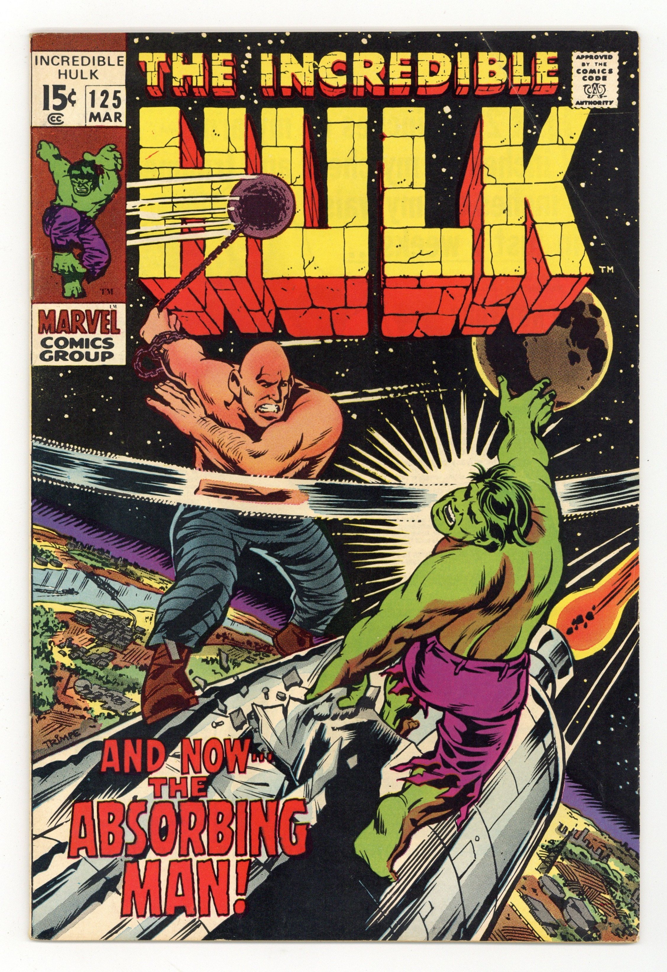 Cover art by Herb Trimpe. And Now, the Absorbing Man!, script by Roy Thomas, art by Herb Trimpe; Banner mans a rocket to blow up a dangerous comet and Absorbing Man hitches a ride back to Earth; The Hulk and Creel collide. Letter from Alan Brennert. 36 pgs. $0.15. Cover price $0.15.