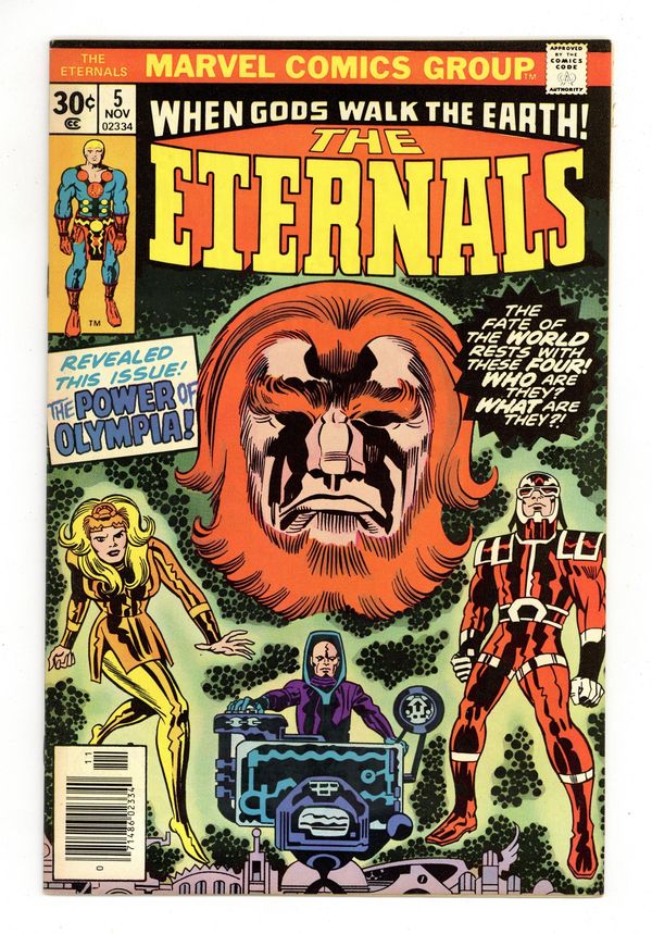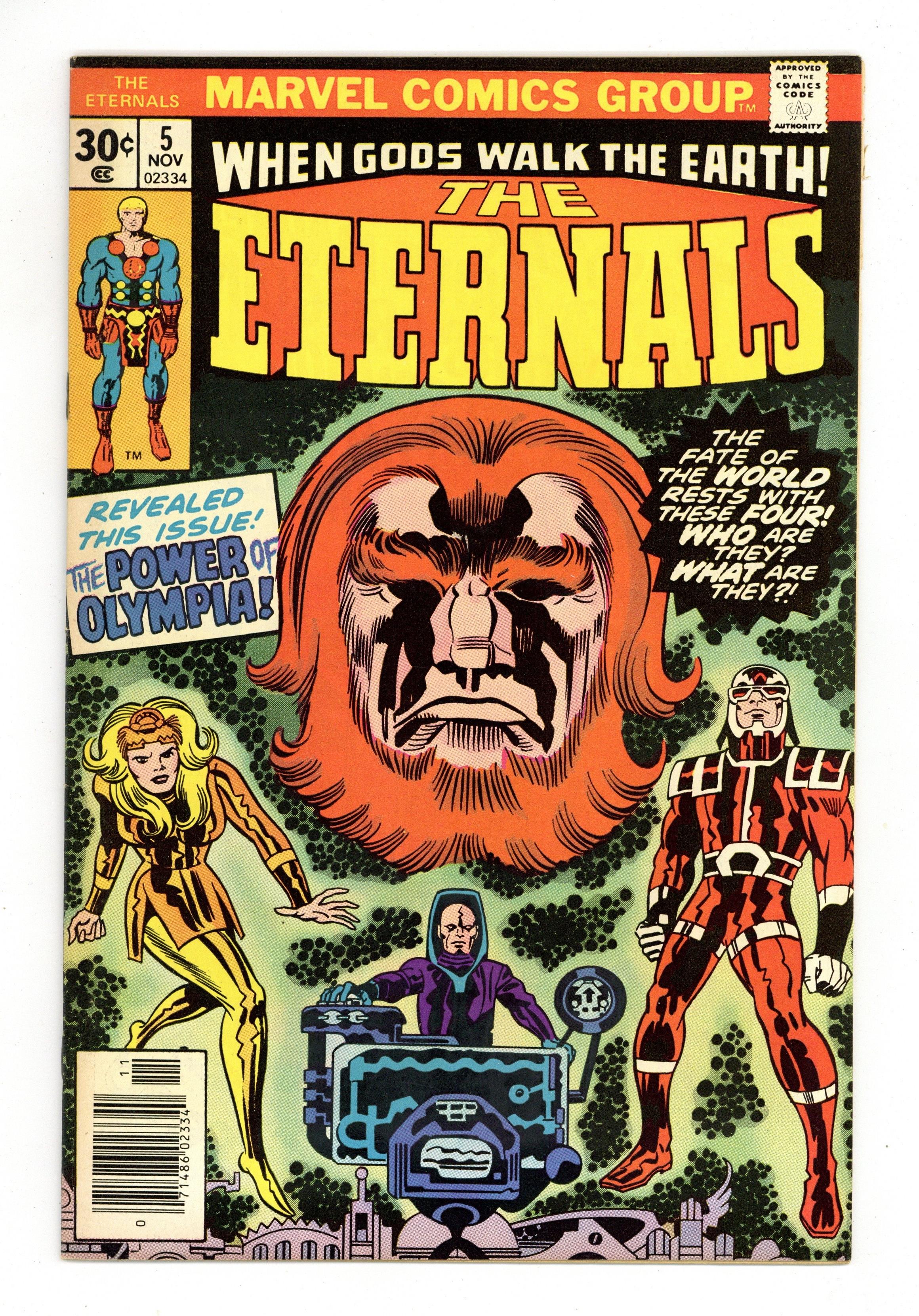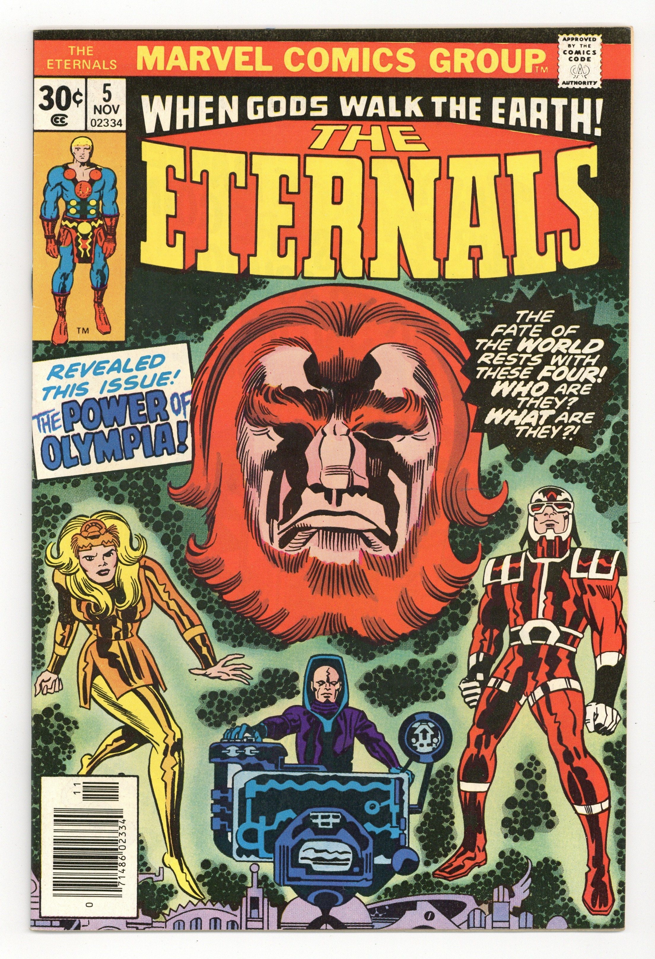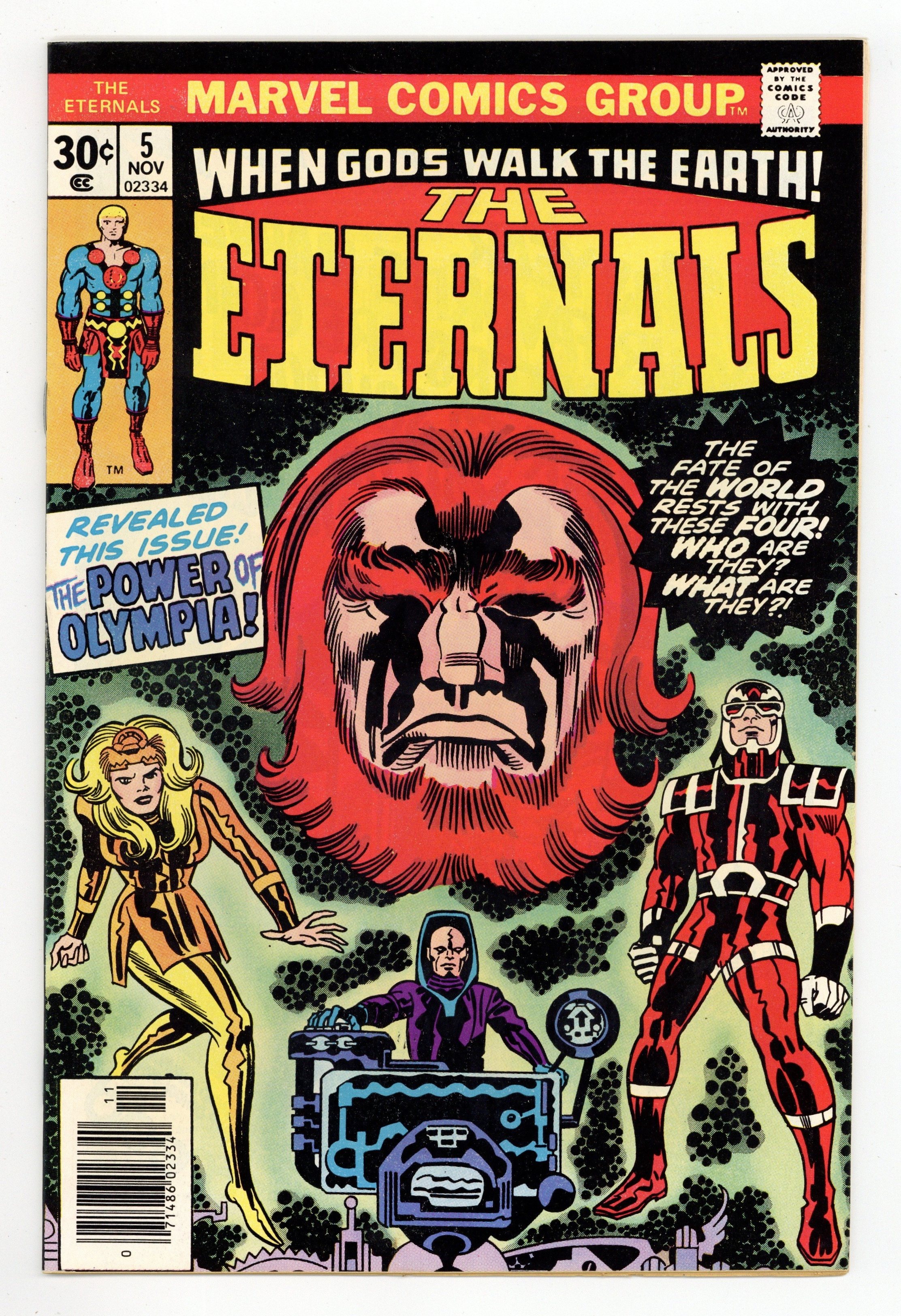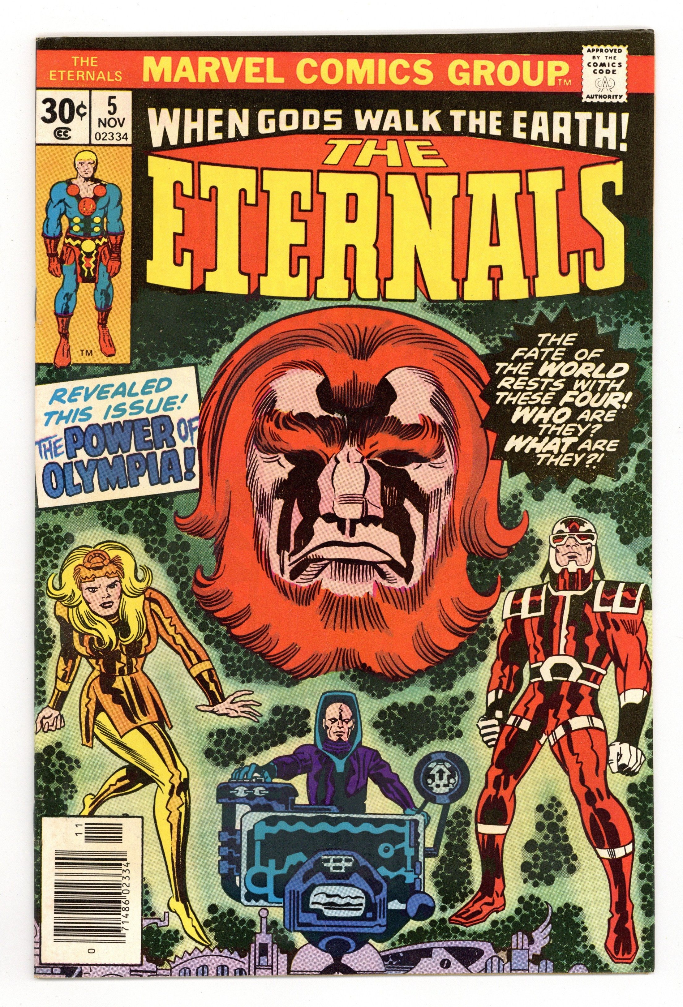Revealed in this issue--the power of "Olympia!" Written by Jack Kirby. Pencils by Jack Kirby. Inks by Mike Royer. Ikaris has been captured by demonic Deviants, but can even these monsters find a way to kill an immortal? Meanwhile, Makarri and Sersi regroup at the mythical homeland of the Eternals – Olympia! The secret is out! Man has discovered the truth behind mythology...it's all real! Notes: 1st appearance of Domo, Thena, and Zuras. Cover price $0.30.