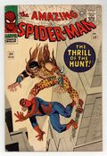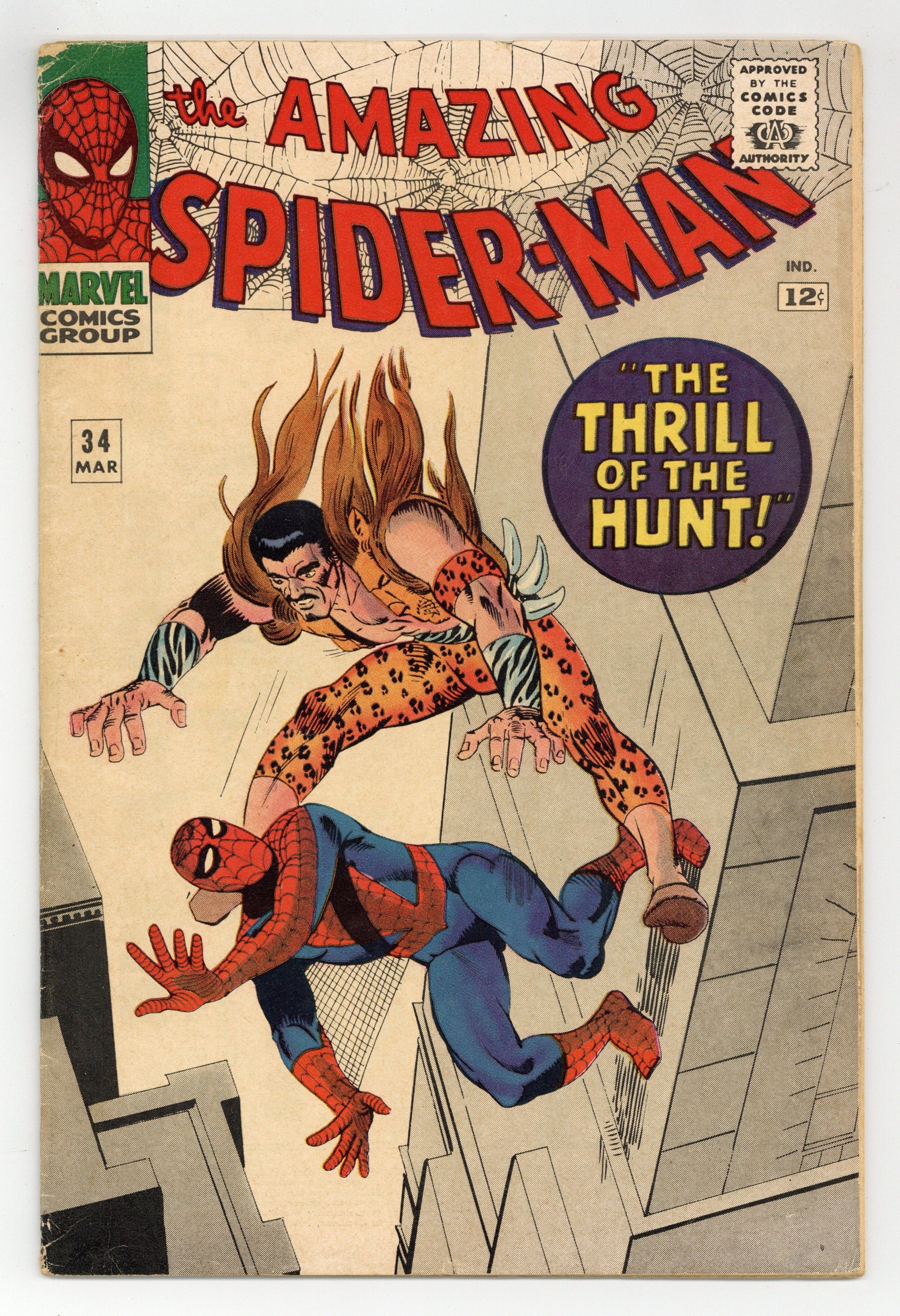 Tags: Marvel Legacy Numbering: Amazing Spider-Man (part 34), Spider-Man$68.00Cover by Steve Ditko. Fourth appearance of Kraven the Hunter in "The Thrill of the Hunt", script by Steve Ditko (plot) and Stan Lee (script), art by Steve Ditko; Kraven dresses up as Spider-Man and harasses J. Jonah Jameson to get Spider-Man to come out for a re-match of their last fight. Ad for Marvel T-Shirts and Mighty Marvel Marching Society items, art by Marie Severin. Letter to the editor from comics editor Richard Pini (Elfquest). 36 pages, full color. Cover price $0.12.