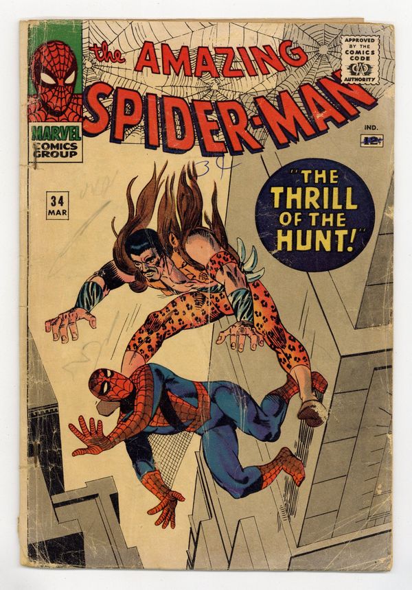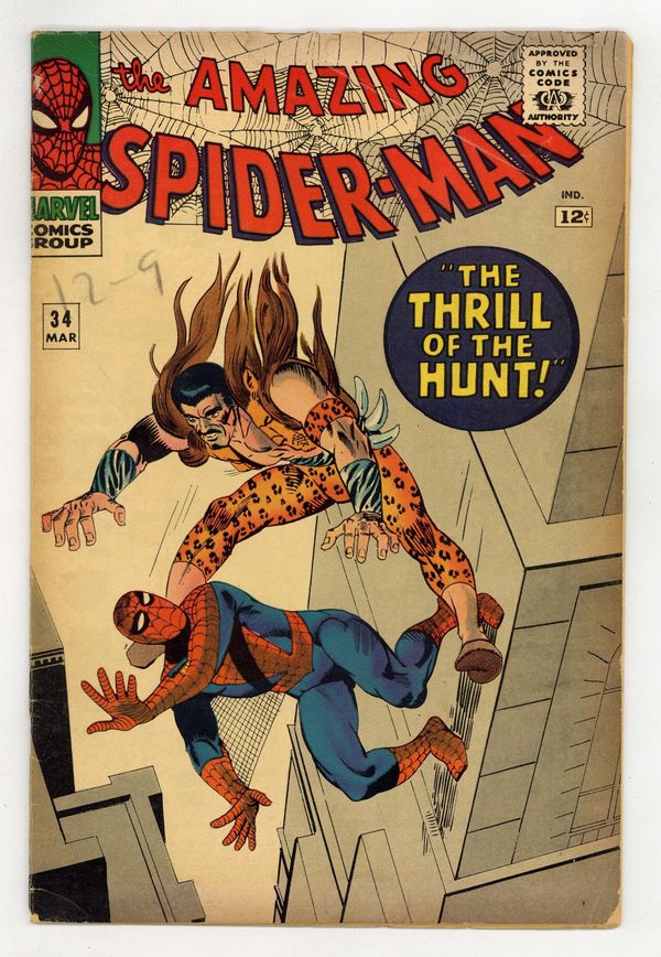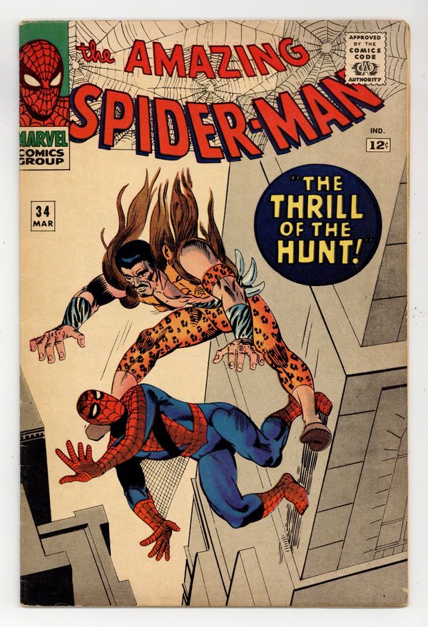 Tags: Marvel Legacy Numbering: Amazing Spider-Man (part 34), Spider-Man$75.00Cover by Steve Ditko. Fourth appearance of Kraven the Hunter in "The Thrill of the Hunt", script by Steve Ditko (plot) and Stan Lee (script), art by Steve Ditko; Kraven dresses up as Spider-Man and harasses J. Jonah Jameson to get Spider-Man to come out for a re-match of their last fight. Ad for Marvel T-Shirts and Mighty Marvel Marching Society items, art by Marie Severin. Letter to the editor from comics editor Richard Pini (Elfquest). 36 pages, full color. Cover price $0.12.