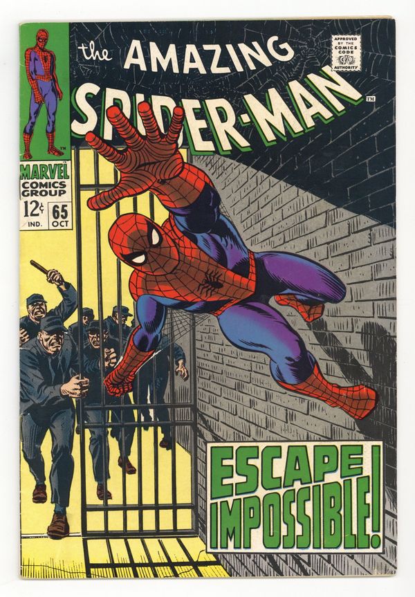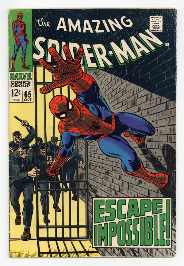 Tags: Marvel Legacy Numbering: Amazing Spider-Man (part 65), Spider-Man$65.00"The Impossible Escape!" Script by Stan Lee. Art by John Romita (layouts) and Jim Mooney (finishes). Cover by John Romita. The wondrous wall-crawler lies unconscious in the street after defeating the Vulture. Thankfully, Captain George Stacy is at scene, and he prevents the crowd from unmasking the web-slinger! However Spider-Man is still taken to a nearby prison -- and placed in the infirmary to recover. In the meantime, six dangerous inmates are preparing to break out of prison. And their plan calls for escaping through the infirmary! Did the sextet pick the wrong day for a jailbreak? Spider-Man says yes! Cameo appearances by Foggy Nelson, Joe Robertson, J. Jonah Jameson, Aunt May, Gwen Stacy, Harry Osborn, and Mary Jane Watson. (Note: This story was reprinted in Marvel Tales #48.) 36 pages. Cover price $0.12.