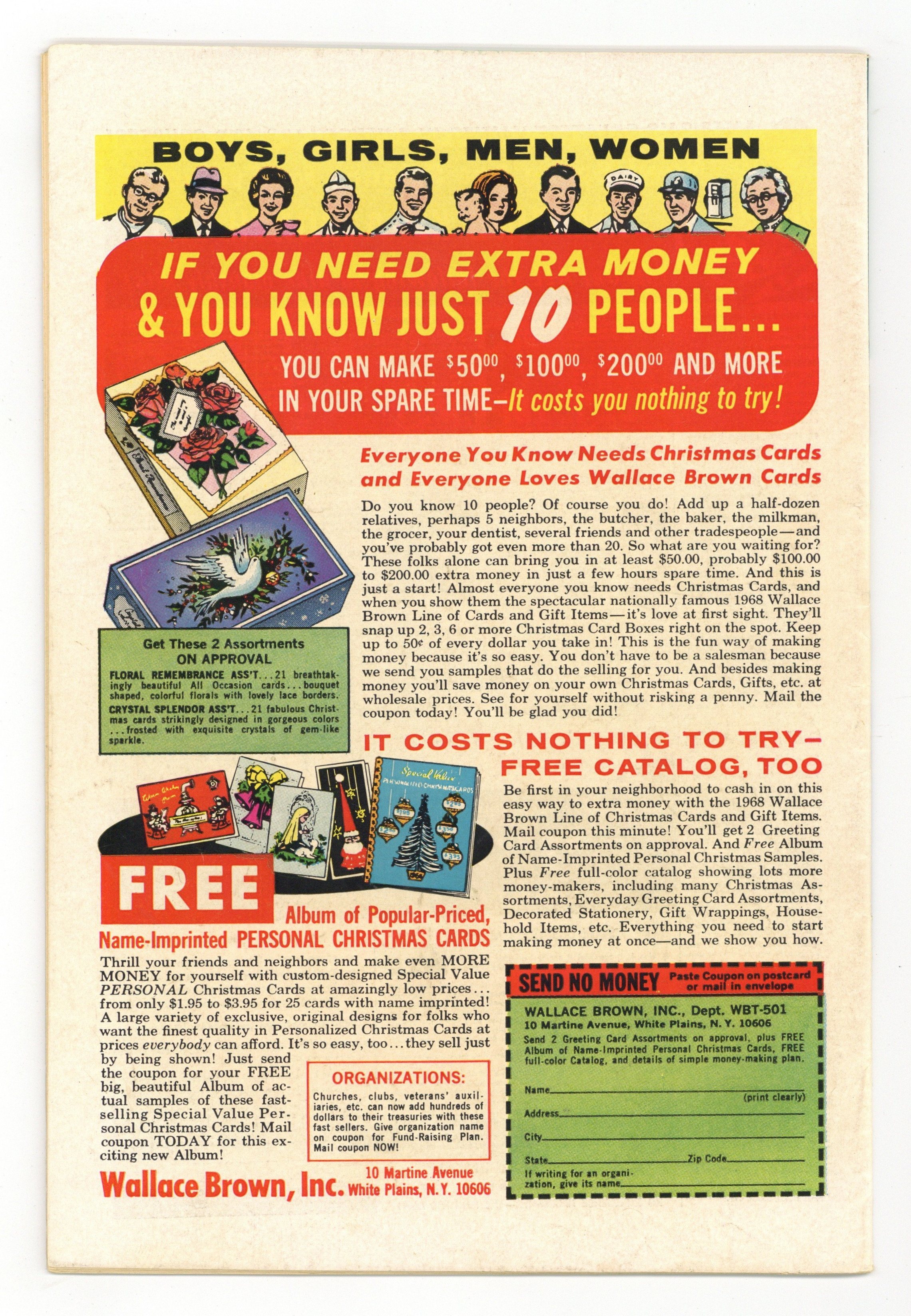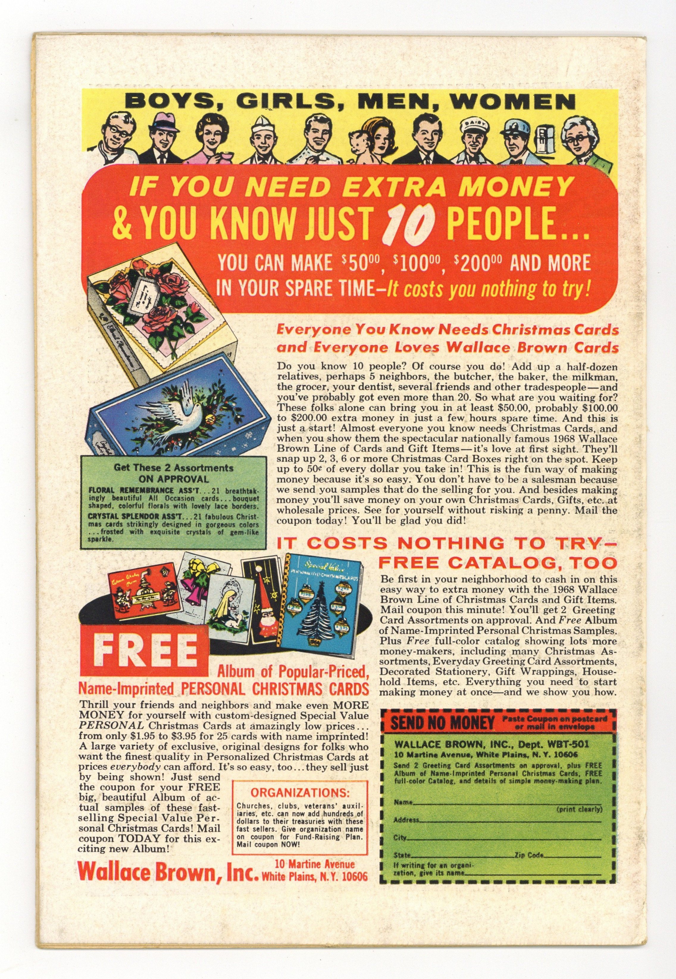 Starts Dec 8 "The Impossible Escape!" Script by Stan Lee. Art by John Romita (layouts) and Jim Mooney (finishes). Cover by John Romita. The wondrous wall-crawler lies unconscious in the street after defeating the Vulture. Thankfully, Captain George Stacy is at scene, and he prevents the crowd from unmasking the web-slinger! However Spider-Man is still taken to a nearby prison -- and placed in the infirmary to recover. In the meantime, six dangerous inmates are preparing to break out of prison. And their plan calls for escaping through the infirmary! Did the sextet pick the wrong day for a jailbreak? Spider-Man says yes! Cameo appearances by Foggy Nelson, Joe Robertson, J. Jonah Jameson, Aunt May, Gwen Stacy, Harry Osborn, and Mary Jane Watson. (Note: This story was reprinted in Marvel Tales #48.) 36 pages. Cover price $0.12.