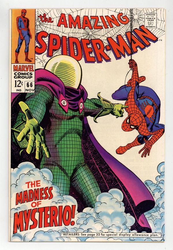 Tags: Marvel Legacy Numbering: Amazing Spider-Man (part 66), Spider-Man$105.00"The Madness of Mysterio!" Part 1 of 2. Script by Stan Lee. Art by John Romita (layouts) and Don Heck (pencils). Inks by Mike Esposito. Cover by John Romita. The Master of Illusion has been plotting revenge against the web-slinger since his bitter defeat in Amazing Spider-Man Annual #4. And this time Mysterio (aka Quentin Beck) hatches a plan involving a miniature amusement park with a miniature Spider-Man! The wall-crawler is about to ride a roller coaster -- whether he realizes it or not! Meanwhile, NormanOsborn has become the Green Goblin again! And he will take his shot at revenge against Peter Parker in Spectacular Spider-Man (1968 Magazine) #2 -- also published this month! Cameo appearances by Betty Brant, Ned Leeds, J. Jonah Jameson, Joe Robertson, Captain Stacy, Gwen Stacy, Aunt May, and Anna Watson. (Notes: The letters page includes letters from comic writers Cary Burkett and Tony Isabella, respectively. This story was reprinted in Marvel Tales #49.) 36 pages. Cover price $0.12.
