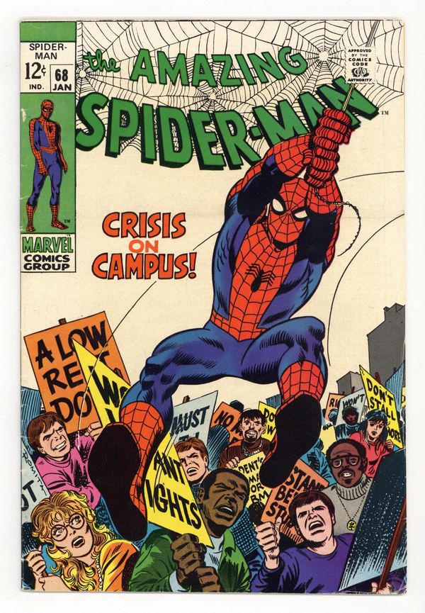 "Crisis on the Campus!" Part 1 of 3. Plot by John Romita. Script by Stan Lee. Art by John Romita (layouts) and Jim Mooney (finishes). Cover by John Romita. The students are restless on the Empire State University campus. The old exhibit hall is being repurposed into an alumni center instead of a low-rent dormitory. And the student body -- including Randy Robertson -- is not happy about it. In the meantime before the exhibit hall closes, it will display one final item: a petrified clay tablet. The priceless tablet is said to hold an ancient secret in its hieroglyphics. And a certain Big Apple crime boss wants the tablet very badly! When the Kingpin learns that student protestors are taking over the exhibit hall, he makes his move to steal the tablet! But the large crime lord doesn't know that Spider-Man's alter ego is a student at ESU. So, when the Kingpin storms the exhibit hall, the web-slinger is right behind him! Can the wall-crawler keep the students safe and the tablet secure...while clashing with the Kingpin? Cameo 36 pgs. appearances by Joe Robertson, J. Jonah Jameson, Gwen Stacy, Aunt May, and Anna Watson. (Note: This story was reprinted in Marvel Tales #51.) 32 pages. Cover price $0.12.