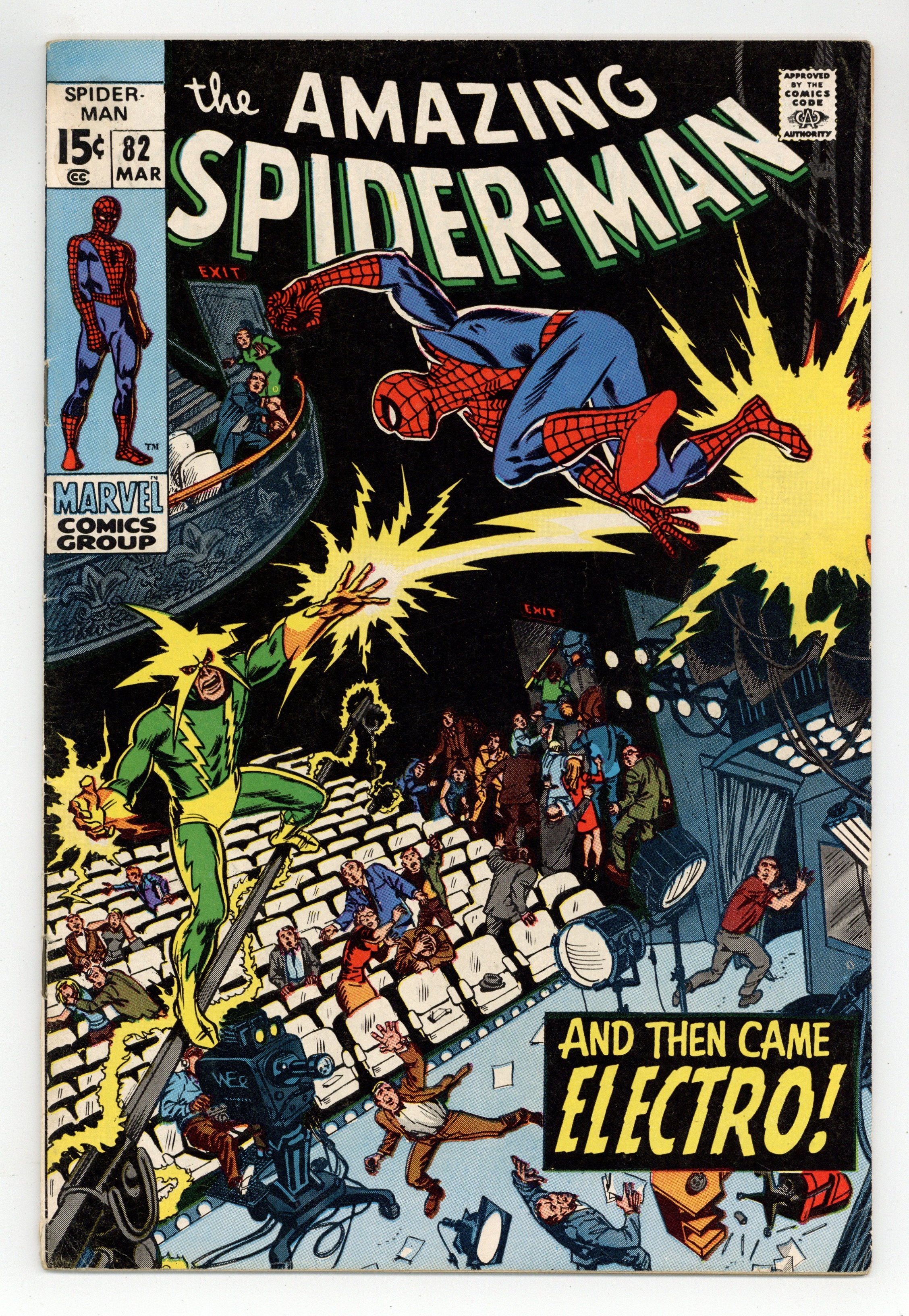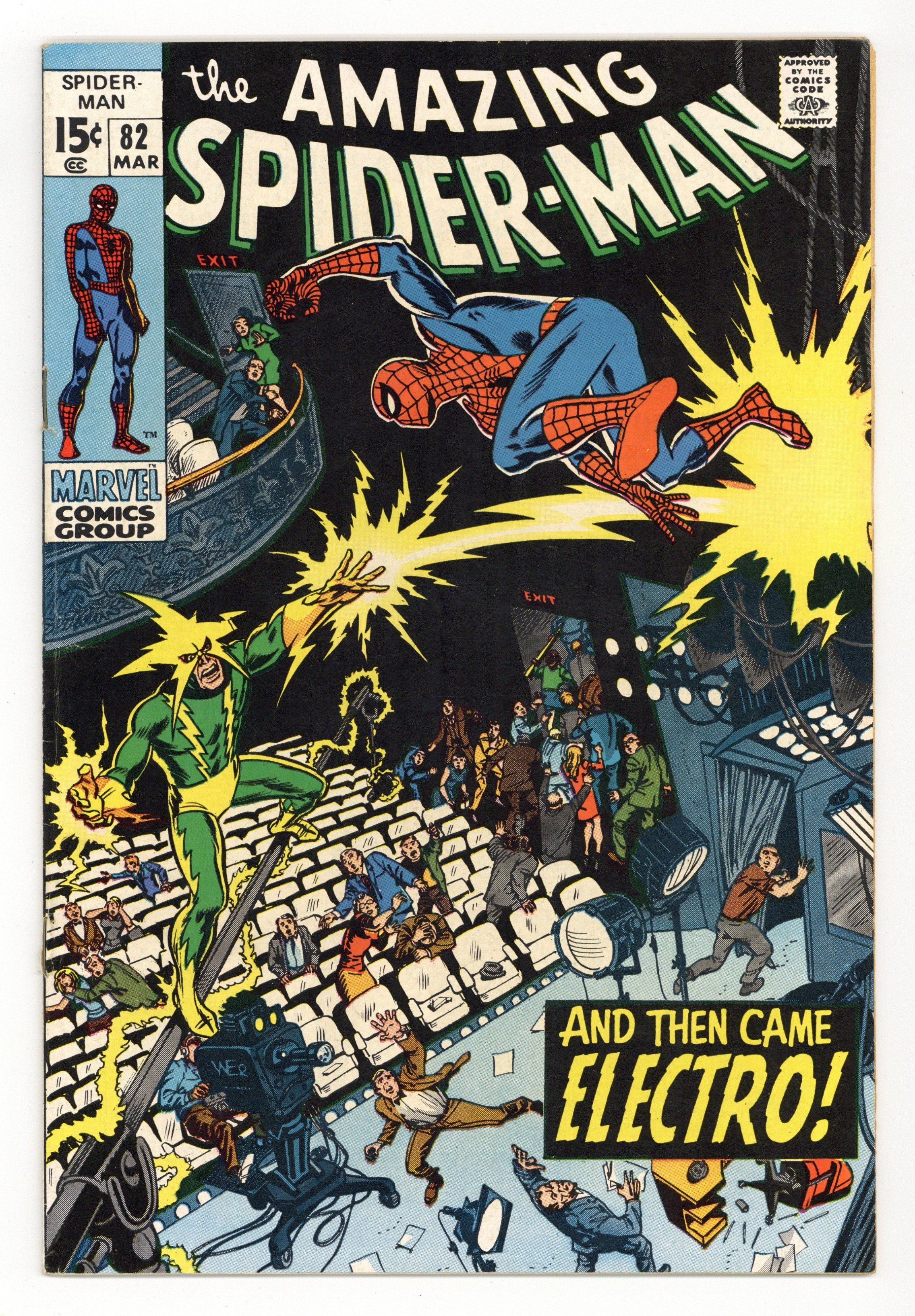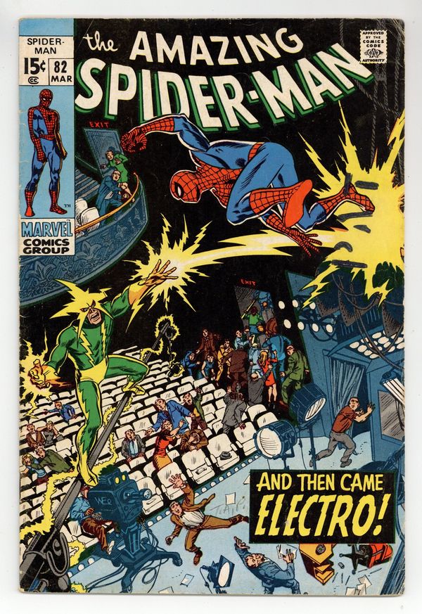 "And Then Came Electro!" Plot by John Romita. Script by Stan Lee. Art by John Romita (layouts) and Jim Mooney (finishes). Cover by Marie Severin. Aunt May's nephew is running low on funds to attend Flash Thompson's farewell dinner. So the wall-crawler stops by the office of a major television network -- and offers to appear on the network's late night talk show! The TV executives eagerly accept the web-slinger's offer, and the news rapidly spreads across town. Later that night a large audience attends the show including: J. Jonah Jameson, Joe Robertson, Captain Stacy, and Max Dillon. Uh-oh, that last name could be trouble! When the curtain rises, the show begins...in more ways than one! The Amazing Spider-Man vs. Electro! What a treat! Cameo appearances by Gwen Stacy, Mary Jane Watson, Harry Osborn, Aunt May, and Anna Watson. (Notes: This issue features a classic Marie Severin cover. John Romita added inks to the cover. Marie Severin contributed pencils & inks to interior pages 14 & 15. The letters page includes a letter from comics writer J.M. DeMatteis. This story was reprinted in Marvel Tales #63.) 36 pages. Cover price $0.15.