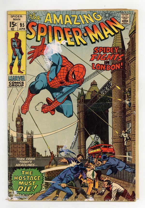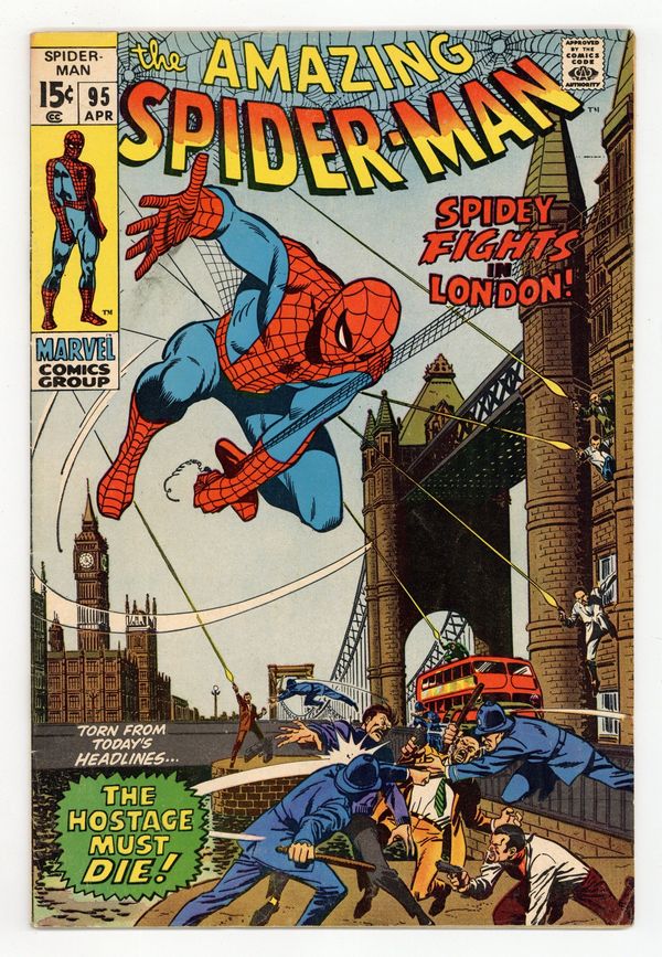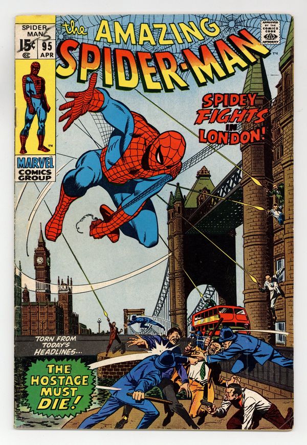 Tags: Marvel Legacy Numbering: Amazing Spider-Man (part 95), Spider-Man$41.00"Trap for a Terrorist!" Script by Stan Lee. Pencils by John Romita. Inks by Sal Buscema. Cover by John Romita and Sal Buscema. As a favor to the Daily Bugle's freelance photographer, Joe Robertson sends Peter Parker to England for a special assignment (and also to visit Gwen Stacy.) Aunt May's nephew is overjoyed about his business trip and quickly hops on an airplane bound for London. However also on the flight is a high-ranking American diplomat -- who is abducted by terrorists once the place lands at Heathrow Airport! Fortunately, Peter brought his familiar red and blue suit across the pond! And the Amazing Spider-Man swings into action from the Tower Bridge to the Big Ben Clock -- to save the American delegate! But will the web-slinger's much-publicized appearance in London derail Peter's plan to visit Gwen? Cameo appearances by J. Jonah Jameson, Aunt May, Anna Watson, Mary Jane Watson, Harry Osborn, Arthur Stacy, and Nancy Stacy. (Notes: This story was reprinted in Marvel Tales #76. The letters page includes a statement of ownership: average print run 596,102; average paid circulation 322,195.) 36 pages. Cover price $0.15.