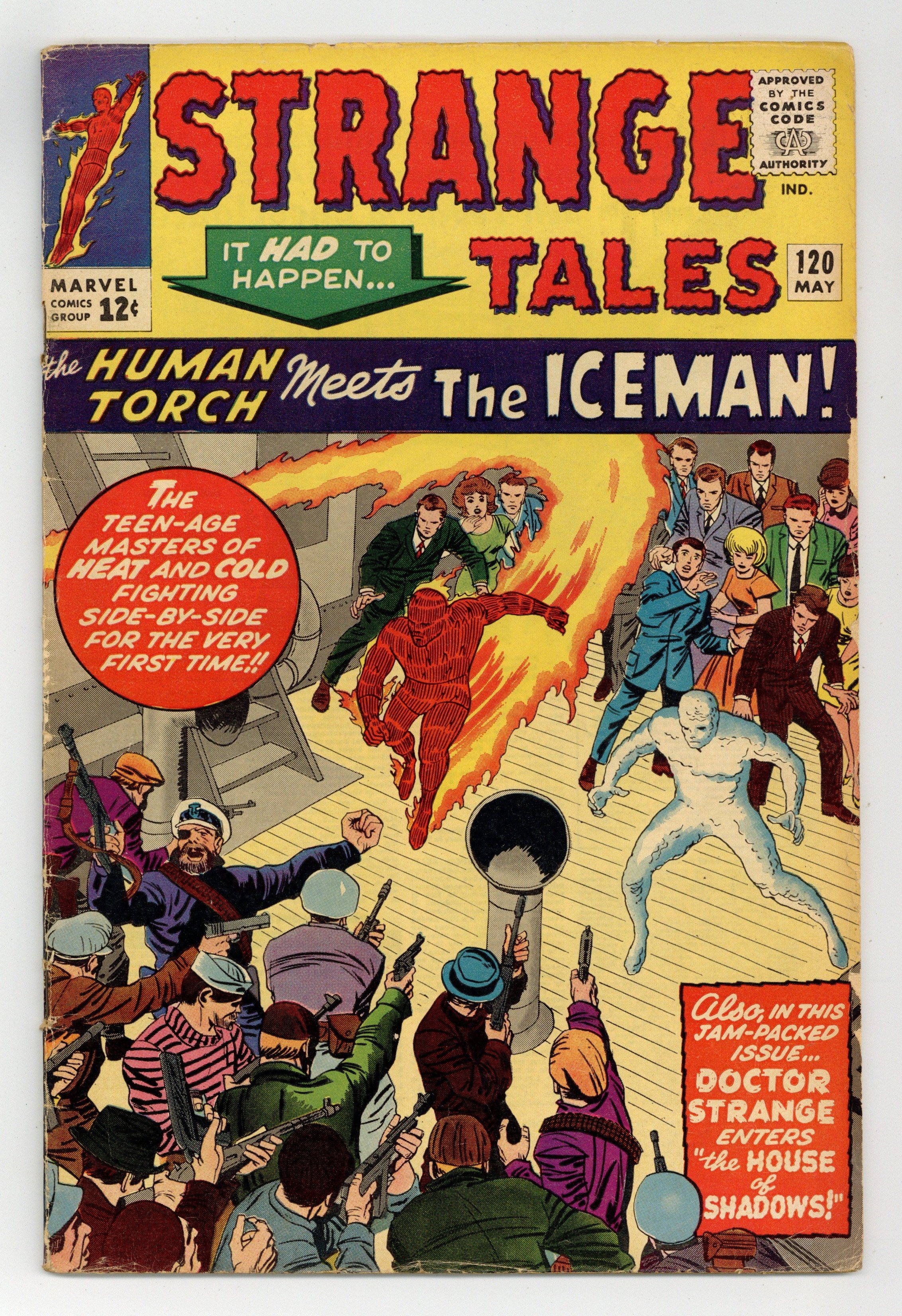 Starts May 11 Cover pencils by Jack Kirby, inks by George Roussos. First Iceman crossover in "The Torch Meets Iceman!", script by Stan Lee (plot, script) and Jack Kirby (plot, un-credited), pencils by Jack Kirby, inks by Dick Ayers; Johnny's riled because a newspaper compares Iceman (of The X-Men) to him; On a cruise liner, Bobby tries to pick up Doris, until Johnny arrives; Before the potential rivalry goes too far, The Barracuda (a modern-day pirate) and his men arrive and take over the ship; Fantastic Four guest appearance; X-Men cameo (Angel, Marvel Girl, and Professor X). "The House of Shadows!", script by Stan Lee and Steve Ditko (co-plot), art by Steve Ditko; Strange is on the scene to observe a TV crew as they prepare to enter & broadcast about a "Haunted House"; Strange discovers something is amiss, as he is unable to enter via his spirit form. The first page of a 2-page text story, "The Salesman." 36 pgs., full color. Cover price $0.12.