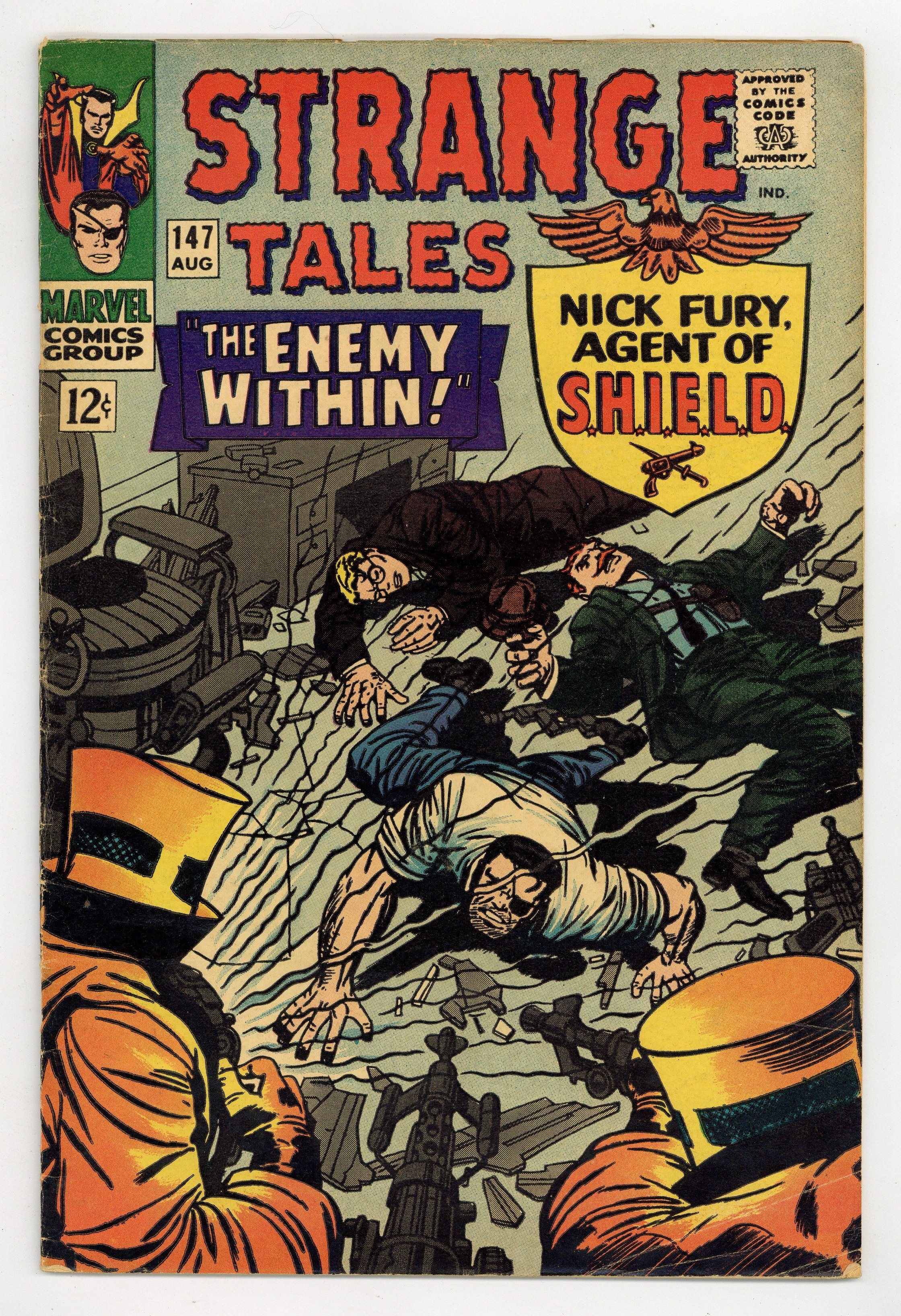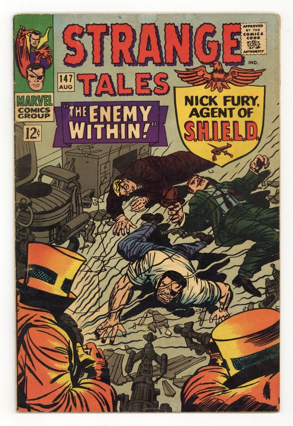 Cover pencils by Jack Kirby, inks by Dick Ayers. Nick Fury stars in "The Enemy Within!", script by Stan Lee and Jack Kirby (co-plot), pencils by Jack Kirby (layouts) and Don Heck, inks by Dick Ayers; Returning from their latest mission, Fury catches hell from the military brass; Count Royale continues bad-mouthing Fury to SHIELD's board of directors; A general explains to Fury how A.I.M. has technology they desperately need, but refuse to do business as long as Fury's in charge. "From the Nameless Nowhere Comes... Kaluu!", script by Stan Lee (pp. 1-5), Denny O'Neil (pp. 6-10), and Bill Everett (co-plot), art by Bill Everett (some panels reprinted from Steve Ditko stories); Doctor Strange walks the streets of Greenwich Village and after stopping a robbery returns home to find his bills unpaid, his bank account empty, and a city building inspector informing him he has six months to bring his house up to code; He instructs Wong to sell some jewels to pay the bills, checks up on Baron Mordo, thinks back on recent events, and then contacts a theatrical agent, Hiram Barney, about a possible nightclub gig. 36 pgs., full color. Cover price $0.12.