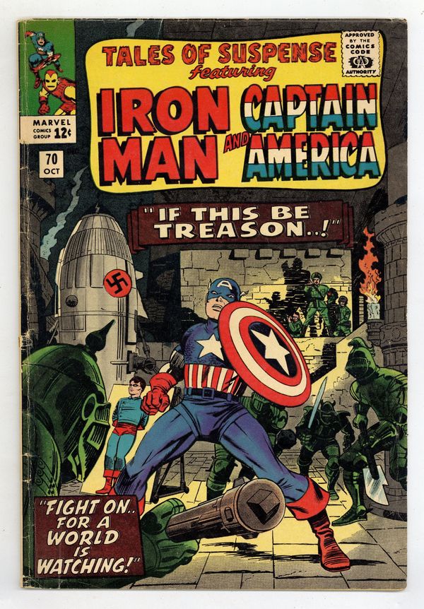 Tags: Marvel Legacy Numbering: Captain America (part 70), Marvel Legacy Numbering: Tales of Suspense (part 70), Captain America, Iron Man$22.00Cover pencils by Jack Kirby, inks by Mike Esposito. "Fight On! For A World Is Watching!", script by Stan Lee, pencils by Don Heck, inks by Mike Esposito (as Mickey Demeo); The Battle between Iron Man and Titanium Man continues. "If This Be Treason!", script by Stan Lee, pencils by Jack Kirby (layouts) and George Tuska (pencils), inks by George Tuska; Dr. Rawlings regrets his collaboration with the Nazis when his sister falls victim to Major Uberhart's ambition to kill Cap and Bucky. 36 pages, full color. Cover price $0.12.