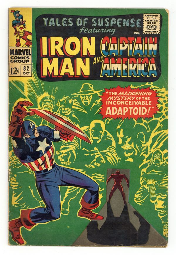 Tags: Marvel Legacy Numbering: Captain America (part 82), Marvel Legacy Numbering: Tales of Suspense (part 82), Captain America, Iron Man$16.00Cover pencils by Jack Kirby, inks by Frank Giacoia. "By Force of Arms!", script by Stan Lee, pencils by Gene Colan, inks by Frank Giacoia; Tony Stark flies into Washington D.C. to present himself to the hearing in his Iron Man armor, however on the way he is attacked by the newly revived Titanium Man who was launched into Washington D.C. by the Soviets. "The Maddening Mystery of the Inconceivable Adaptoid!", script by Stan Lee, pencils by Jack Kirby, inks by Frank Giacoia; The Adaptoid escapes from his AIM creators and invades Avengers Mansion to attack Captain America; Guest appearances by the Scarlet Witch, Quicksilver, and Bucky Barnes. Red Skull cameo; The story crosses over with a SHIELD story in Strange Tales #149. Ad for the Merry Marvel Marching Society. 36 pages, full color. NOTE: 1st appearance of Adaptoid. Cover price $0.12.