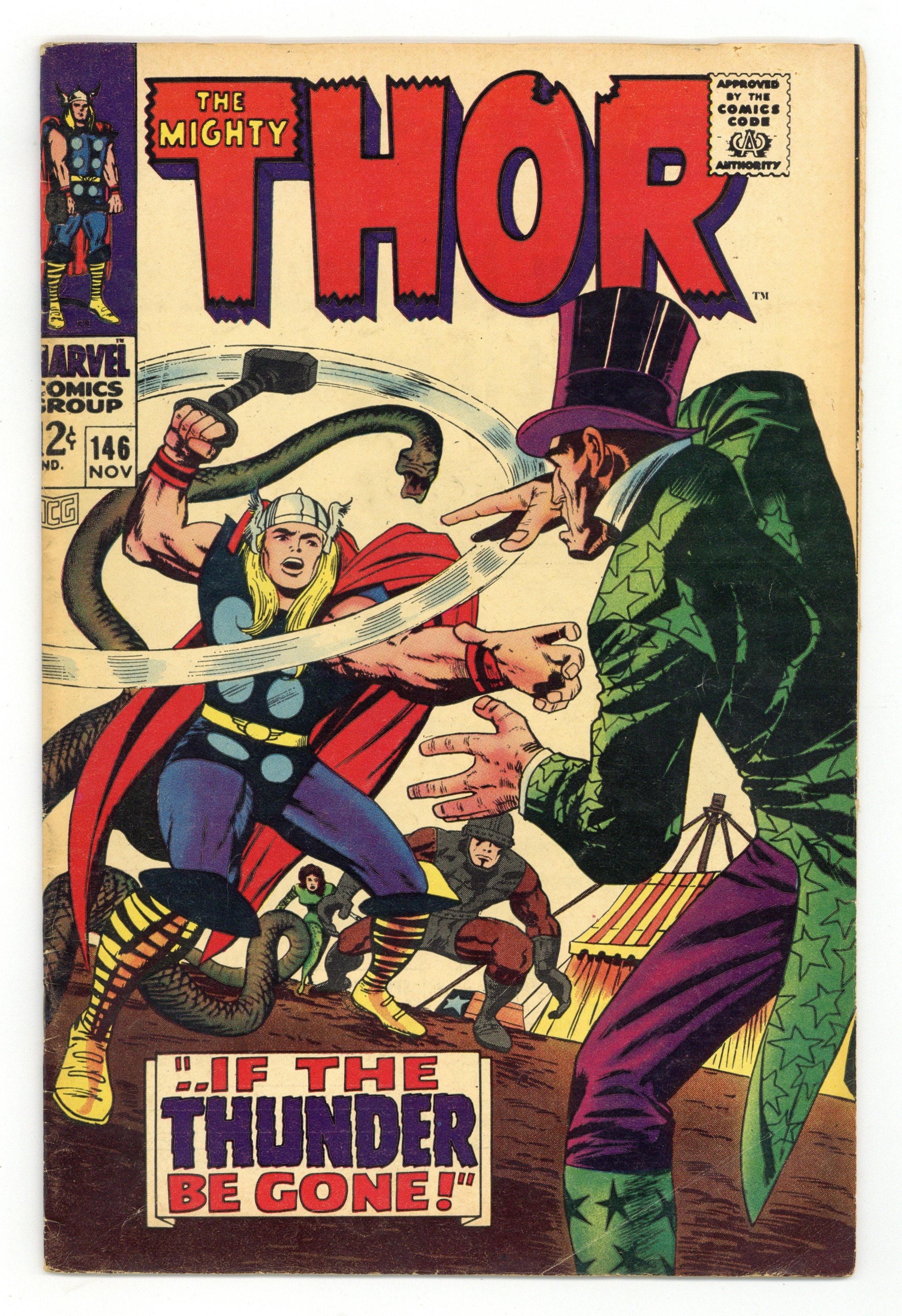 Tags: Marvel Legacy Numbering: Thor (part 146), Thor$19.00Cover pencils by Jack Kirby, inks by Vince Colletta. "If the Thunder Be Gone!", script by Stan Lee, pencils by Jack Kirby, inks by Vince Colletta; The weakened and hypnotized Thor helps the Circus of Crime to steal the Golden Bull; Sif and Balder watch from Asgard as the police confront Thor. Appearances by Jane Foster and Odin. Back-up story: "The Origin of... the Incomparable Inhumans!", script by Stan Lee, pencils by Jack Kirby, inks by Joe Sinnott; Randac enters the Terrogen Mists. This is the first of a seven-part series explaining the origins of the Inhumans. 36 pgs., full color. $0.12. Cover price $0.12.