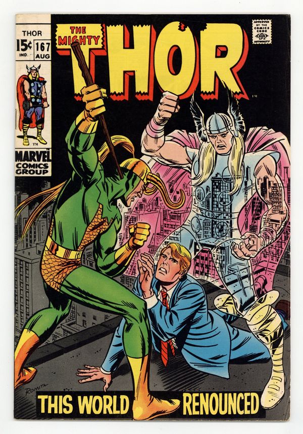 Tags: Marvel Legacy Numbering: Thor (part 167), Thor$17.50Cover by John Romita. "This World Renounced!", script by Stan Lee, pencils by Jack Kirby, inks by Vince Colletta; Thor accepts his punishment at the hands of Odin following his descent into Warrior Madness; As penance, Thor is forbidden from defending Midgard!; What will happen to Earth without a god to defend it?; Enter Balder the Brave, the new protector of mortals!; But before Balder can say "Yggdrasil", he must fend off the combined evil of Loki and Karnilla! 36 pgs., full color. $0.15. Cover price $0.15.