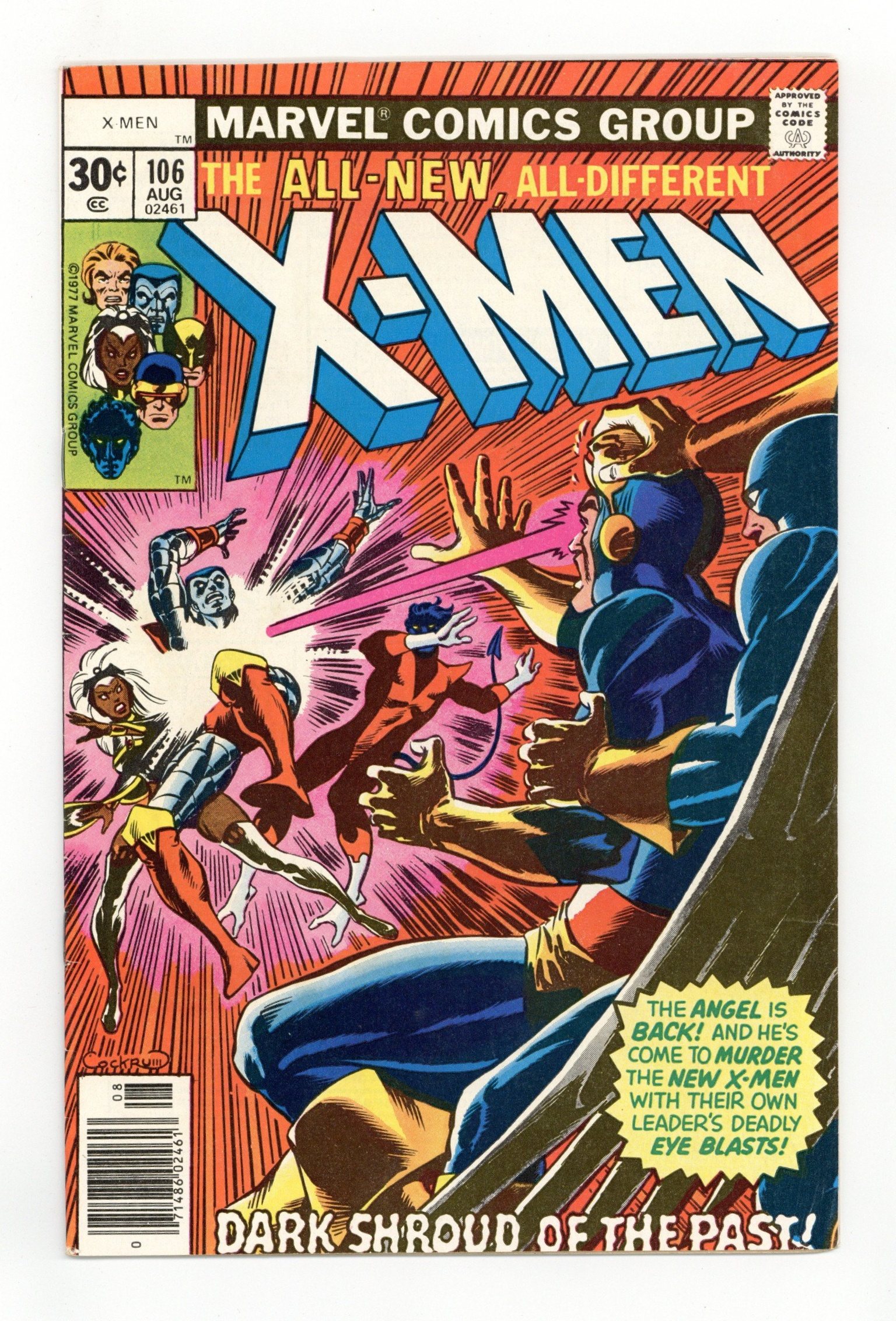 Starts Dec 22 Cover by Dave Cockrum. Dark Shroud of the Past!, script by Chris Claremont and Bill Mantlo, art by Dave Cockrum, Bob Brown, and Tom Sutton; The X-Men are working out in the Danger Room when the evil aspect of Xavier's mind attacks them with versions of the old X-Men. A fill-in issue that Classic X-Men skipped for reprinting. The story that began in Uncanny X-Men #105 continues in Uncanny X-Men #107. Short eulogy of Bob Brown. 36 pgs., full color. $0.30. Cover price $0.30.