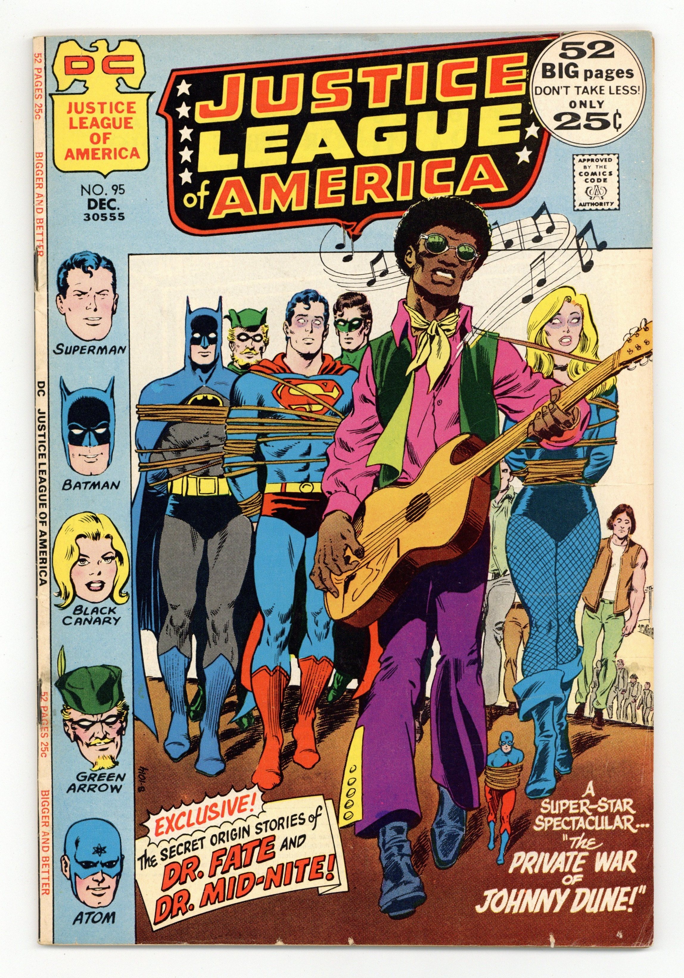 Cover pencils by Neal Adams, inks by Murphy Anderson. The Private War of Johnny Dune!, script by Mike Friedrich, pencils by Dick Dillin, inks by Joe Giella; Batman investigates the disappearance of Flash, Hawkman, and Green Lantern; American serviceman Johnny Dune is home from the war and can't get a job. How He Began starring Dr. Mid-Nite, Myra Mason, and "Killer" Maroni, script by Charles Reizenstein, art by Stan Aschmeier. The Origin of... Doctor Fate starring Doctor Fate, Sven Nelson, Nabu the Wise, and Negal, script by Gardner Fox, art by Howard Sherman. 52 pgs. $0.25. Cover price $0.25.